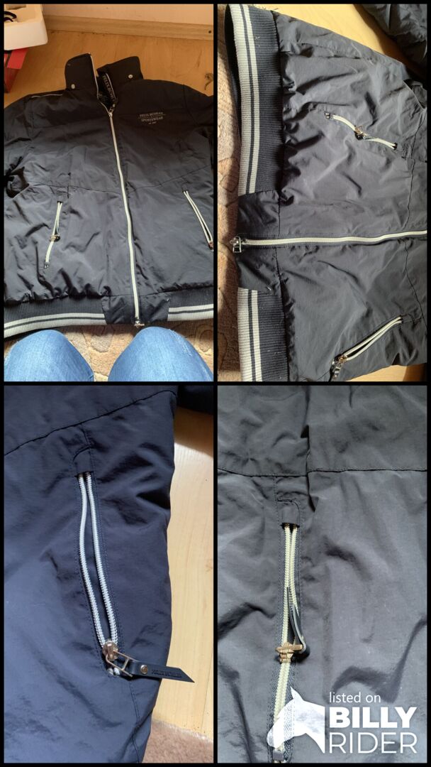 Felix Bühler jacka - Jag säljer en Felix Bühler blousonjacka i blått och svart. Jackan är vattentät och vattenavvisande så att du kan bära den i stallet i alla väder. Jackan är säkrad med en tvåvägs dragkedja och kan justeras med dragkedjan när du rider. Fickorna är försedda med dragkedja. Det finns inga hål eller fläckar.