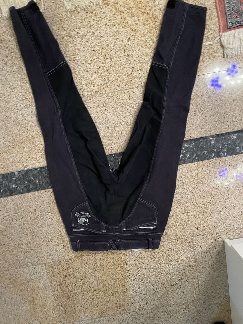 Jeansreithose und Größe 38 mit Ledervollbesatz.
