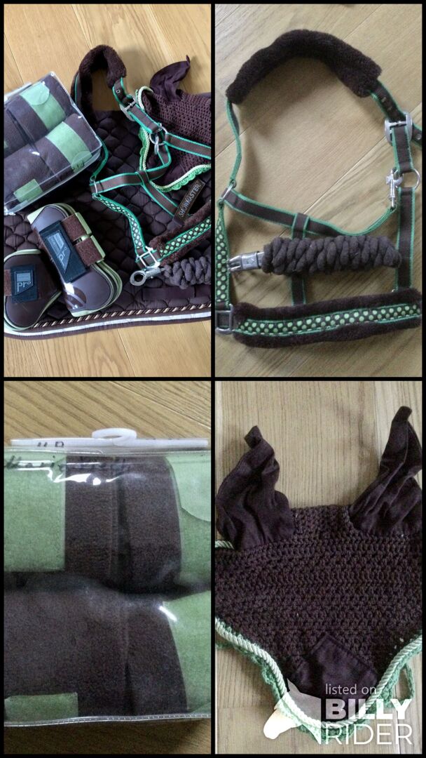 Felix Bühler Norton Brown Green Set Saddle Pad Spats Bandages - Jag erbjuder här en nästan ny uppsättning av Felix Bühler, Showmaster och Norton i storlek warmblood, dressyr. -Sadelunderlag från Showmaster i brun/guld. -Halter med rep av Felix Bühler i brunt/grönt -Bandages av Felix Bühler i brunt/grönt -Flyghätta av Felix Bühler i brunt/grönt -Jaggar från Norton pro i brunt/grönt Färgen är varmare än på bilderna. Det ursprungliga priset var över 170 euro.
