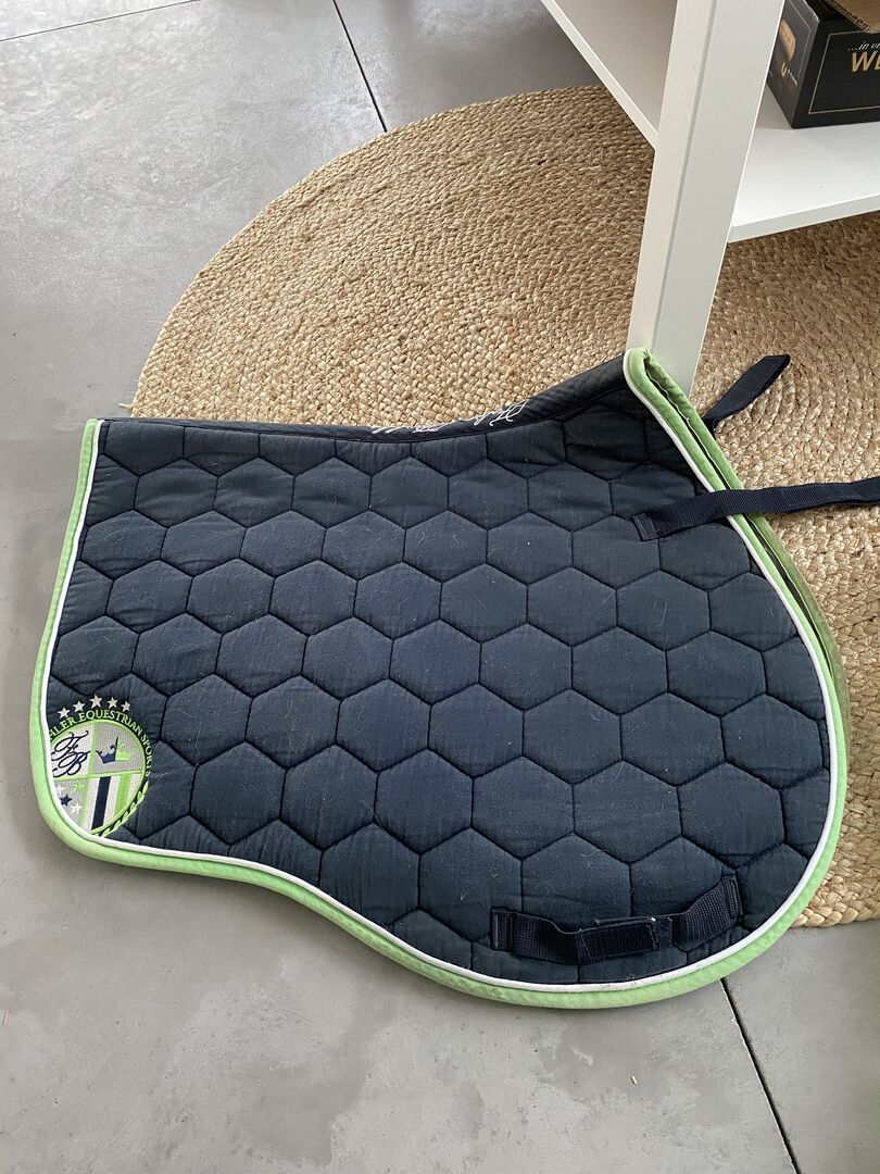 Jag säljer mitt lite använda hoppsadelunderlag med matchande bandage. Båda i nyskick.