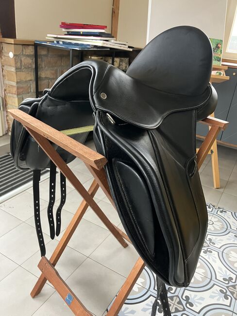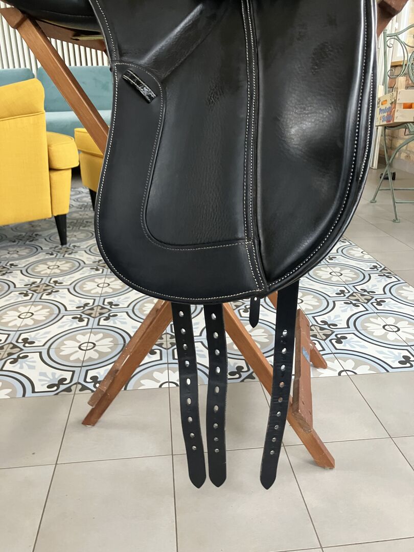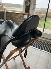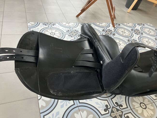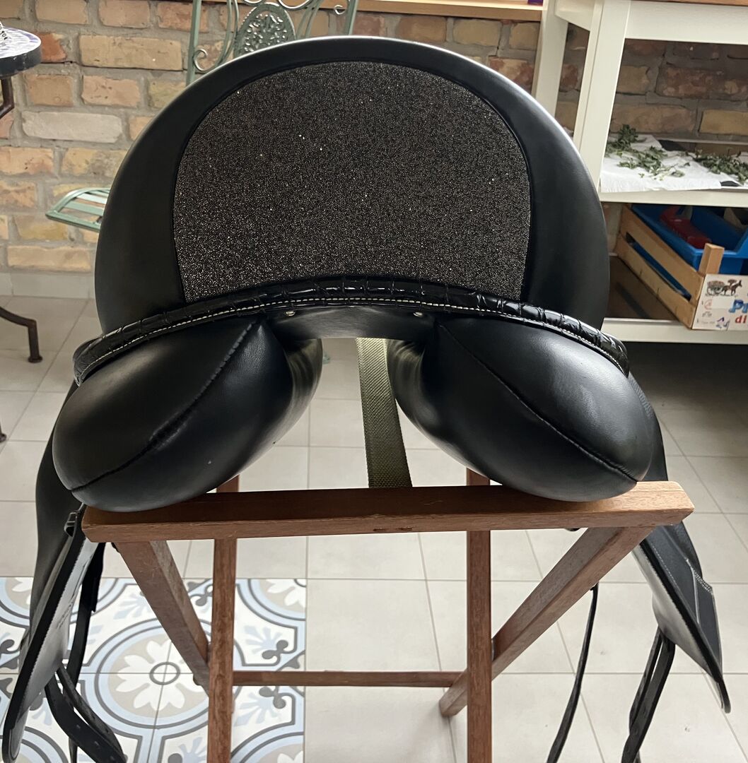 Fin dressyrsadel av Louisa Koehne - lite använd, mycket bra skick - Till salu är en mycket elegant, högkvalitativ dressyrsadel från Louisa Koehne sadelmakeri, som bara har använts lite och är i mycket gott allmänt skick. Sadeln imponerar inte bara med sin bekväma, djupa sits utan också med sitt eleganta utseende: det glansiga svarta läder som används och den subtila glitterinsatsen på pommeln gör den till ett riktigt blickfång. Jag köpte sadeln ny av fru Koehne för två år sedan. Den var ursprungligen skräddarsydd för en annan person, vilket är anledningen till att det finns ett ingraverat namn under sadelklaffen (se foto). Detaljer om sadeln: - Sadelns storlek: 17,5 tum - Sadelkammarens bredd: 24 cm (se foton) - Tre sadelgjordsremmar tillgängliga → individuell justering av sadelgjorden möjlig - Knäskydd med kardborreband som kan bytas ut eller justeras efter behov - Mjukt vadderad sits och välformade knäveck för en stabil sits - Väl underhållet läder, inga sprickor eller strukturella defekter Notering om skick: Sadeln har ett litet visuellt skönhetsfel: särskilt när den inte rids är sadelklaffen inte helt nära knävecken och sticker ut något (se bilder). Detta påverkar inte dess funktion när den rids. Sadeln har alltid förvarats på en torr plats och behandlats varsamt.