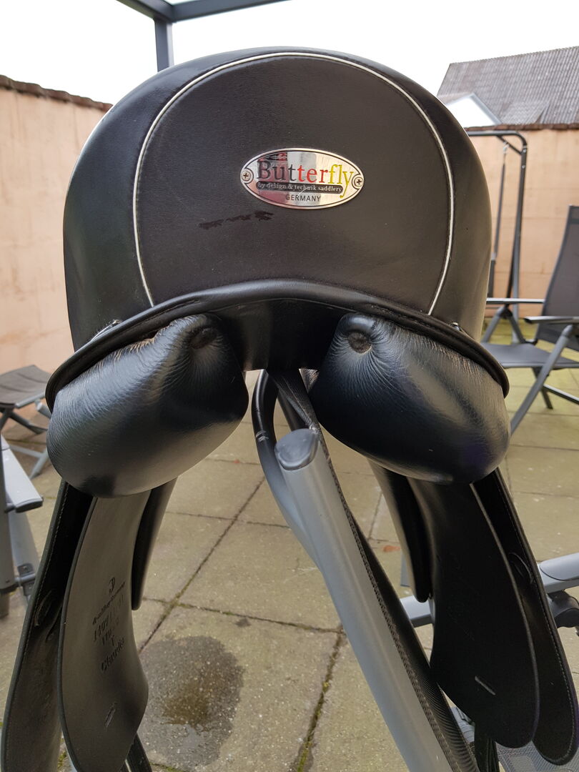 Fjäril Claudia 17 Zoll - Butterfly Claudia 17 tums dressyrsadel. Perfekt för hästar med kort sadel. Sadeln säljs endast på grund av ett nyinköp. Den användes på en tysk ridponny med en mycket kort kontaktyta. Den är i gott skick med små tecken på användning.