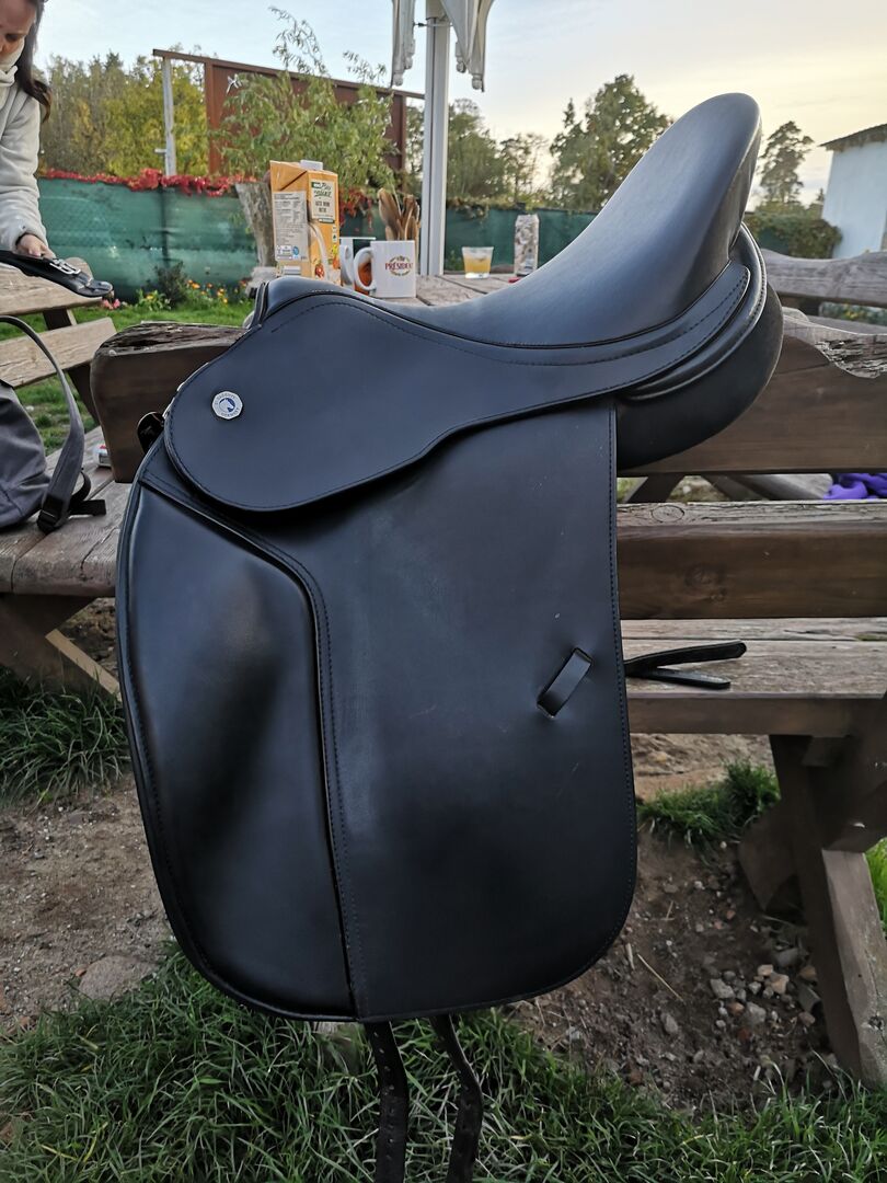 Fjäril dressyrsadel Comfort Andrea Bethge 17 tum - Jag har en Andrea Bethge comfort i 17 tum med bred magsäck. Det är en halvlåg sadel och sadeln är svart. Jag har också extra hoppblock. Jag köpte sadeln ny i februari 2021 och jag har fakturan. Däremellan har jag inte ridit på ungefär trekvart år. Sadeln har alltid förvarats torrt och med ett sadelskydd. Sadelträdet är fortfarande under garanti fram till februari 2026.