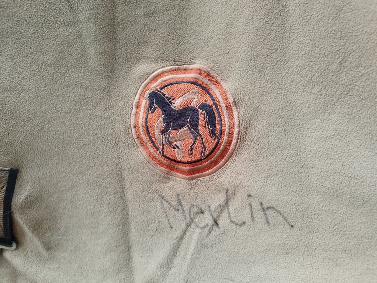 Fleece filt- 130cm - Jag ger bort min 130 cm långa fleecefilt eftersom jag inte längre behöver den. Den är fortfarande i gott skick. Tyvärr fanns bara namnet "Merlin" skrivet på filten (se bild).