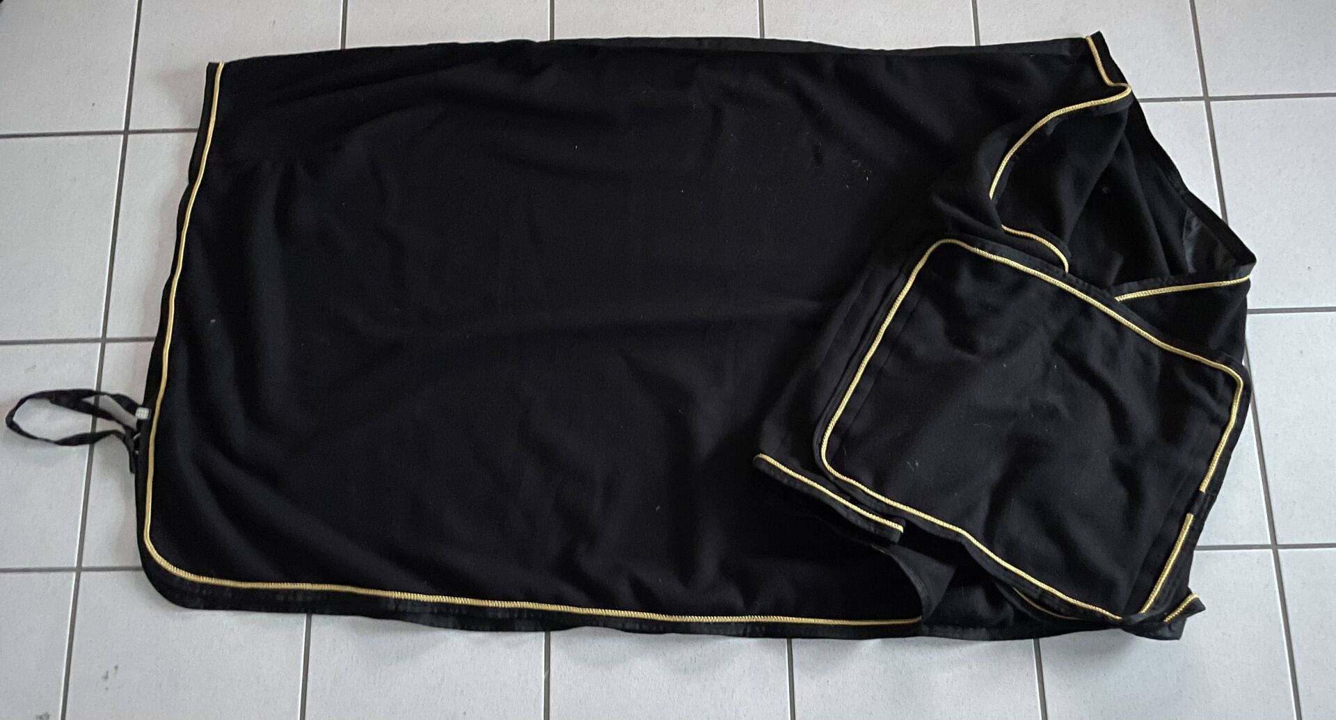 Fleecematta Sweat Rug Paradise Rug - Elegant svart filt med gyllene snöre. Framsida med haklapp som kan tas av. Filten är ett prov/unik. Frakt är möjlig mot betalning. Privat försäljning, ingen retur eller byte.
