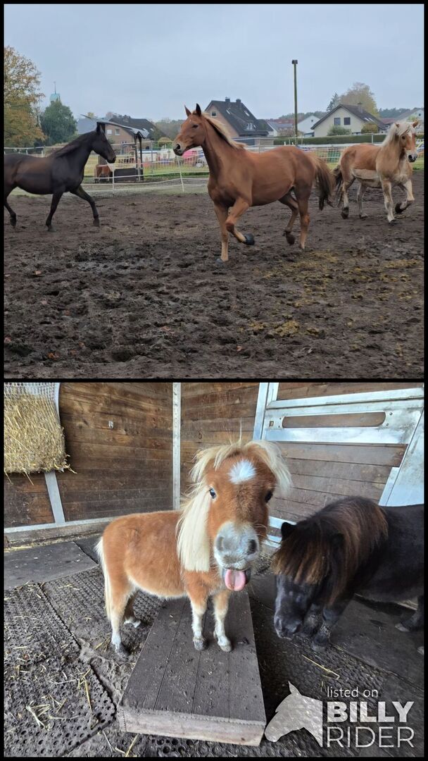 Meine kleinen Shettys sind ein Jährling und 4 Jahre alt. Mit denen kann man schöne Spaziergänge machen. Würden auch gerne deine Snacks tragen um die Welt draußen zu erkunden und zum jeden spaß zu haben. Können auch schon einige Zirkuslektionen und der älteste wird vorbereitet um Sulki zu ziehen und springen tut er auch sehr gerne aber nur an erfahrene Menschen da er weiß wie er seinen willen durchsetzten kann allso eine herausforderung.