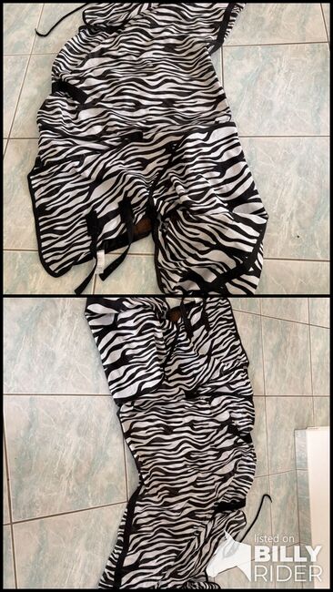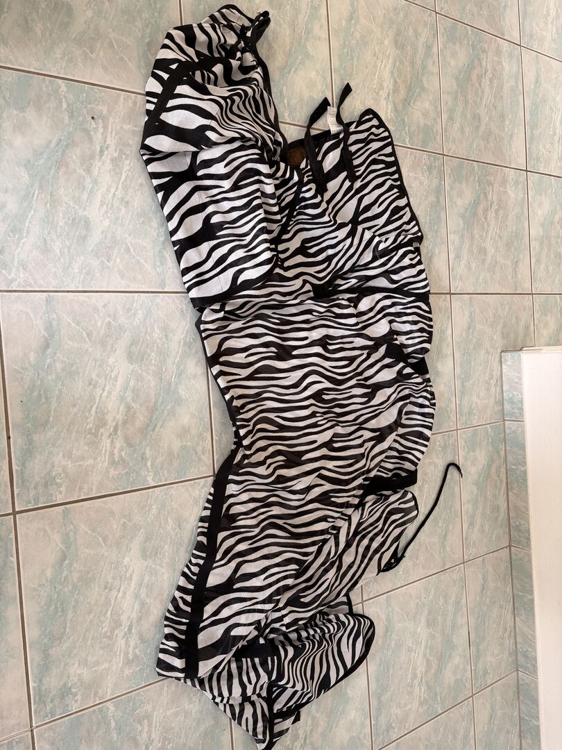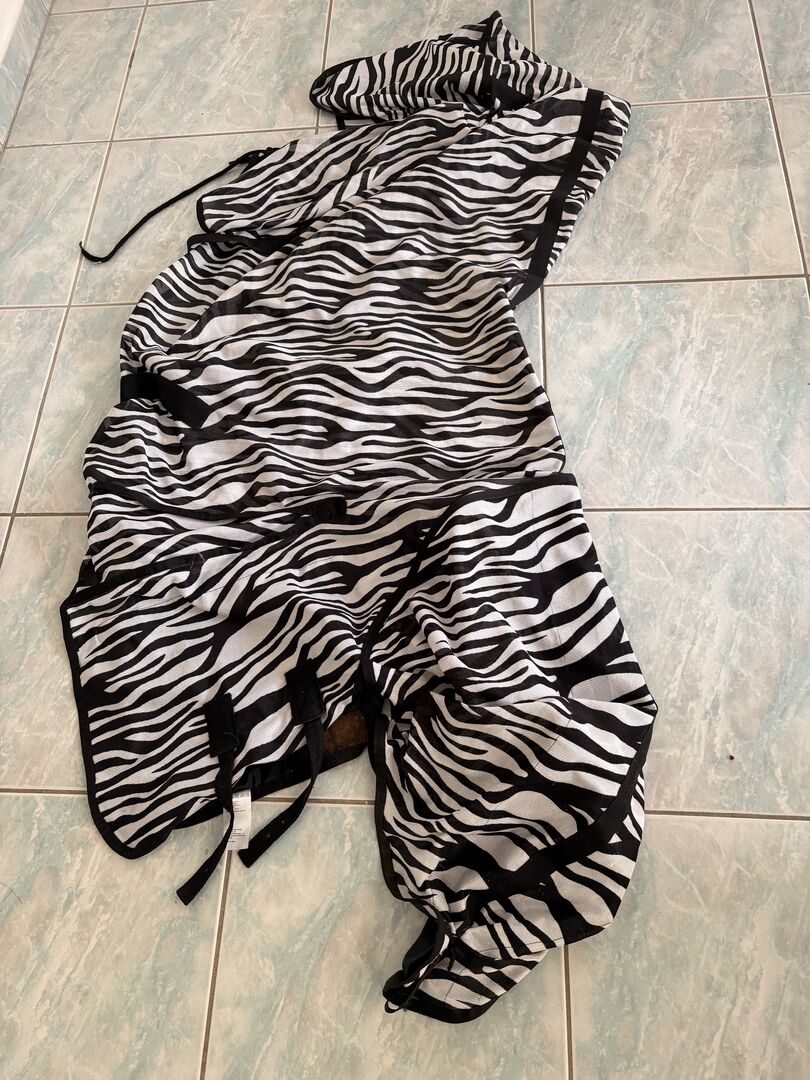 Flugmatta med halsdel så gott som ny 135 cm - 135 cm flugtäcke i zebralook med halsdel används inte ofta då det är lite för trångt för mitt sto