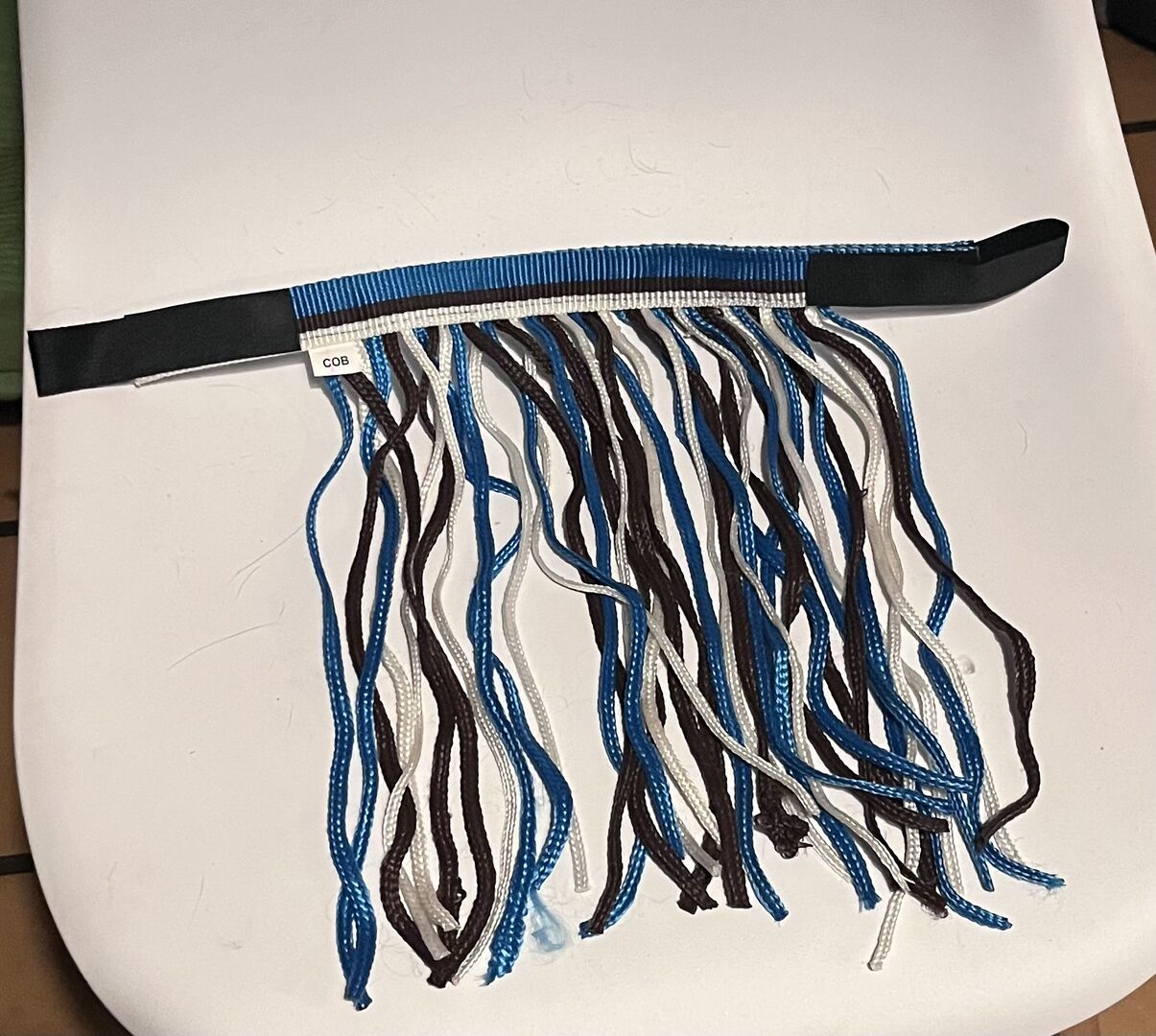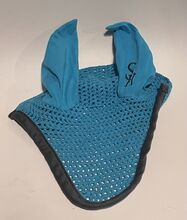 Flugskydd för kobbe/ponny - Två flugmössor, en med kardborreknäppning och en med snodd. Det finns också ett flugpannband. Allt passar en andalusier, så jag skulle säga att Cob är i rätt storlek. Allt är nytvättat och utan defekter.