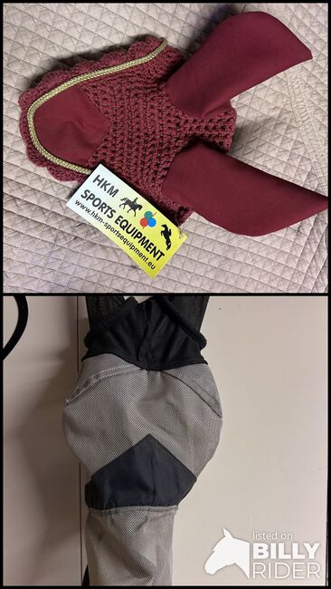 Flyghätta Hkm, flygmask - Hej, jag erbjuder en ny HKM flughatt för ponnyer. Den kommer i en elegant Bordeaux-färg och är dekorerad med en elegant gyllene sladd. Denna flughatt skyddar din ponny optimalt från irriterande insekter och är ett riktigt blickfång. Den är helt ny, oanvänd och har fortfarande kvar originaletiketten, perfekt för omedelbar användning. Jag erbjuder också en flugmask för paddocken. Skriv bara till mig om du har några frågor.