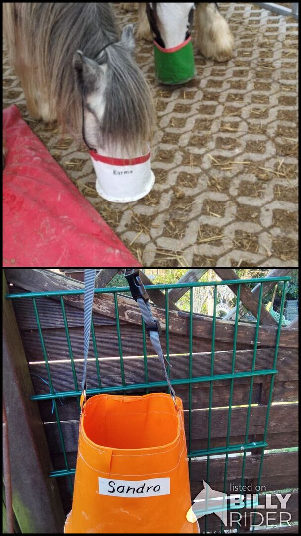Foderpåse, idealisk för gruppboende och terrängcykling - Jag syr foderpåsar till alla hästar, från ponnyer till shirehästar. Helt tvättbar eftersom den är tillverkad av lastbilspresenning, finns i gult, blått, rött och grönt. Justerbar huvudrem. Inga sömmar inuti, så lätt att hålla ren. Mycket stabilare och mer hygienisk än tygpåsar! Eventuella reparationer ingår i priset. Återbetalning mot porto.