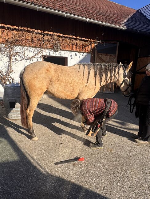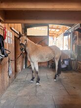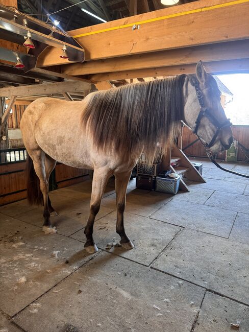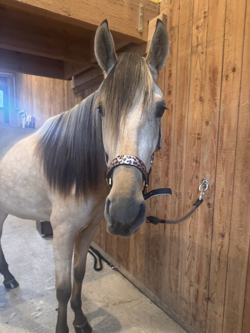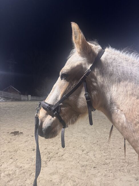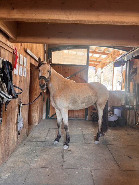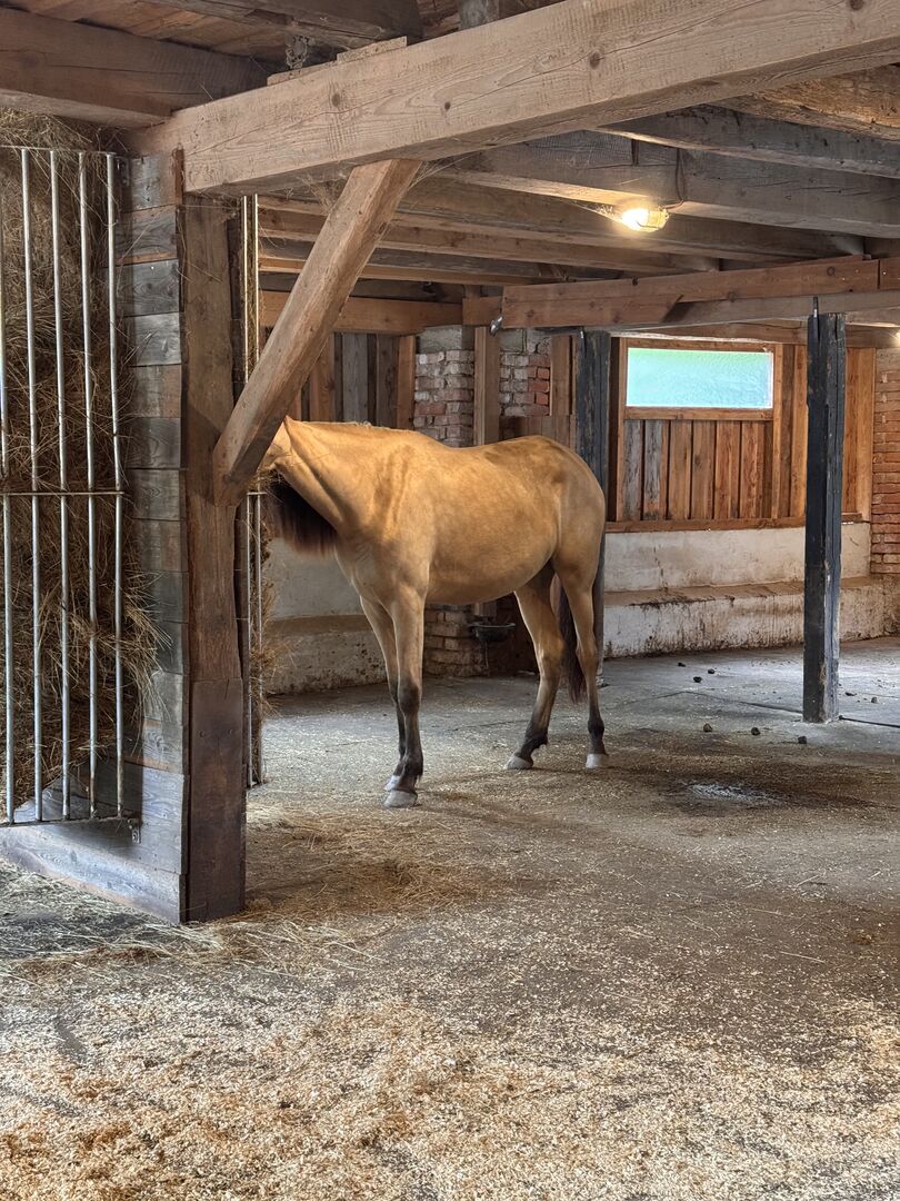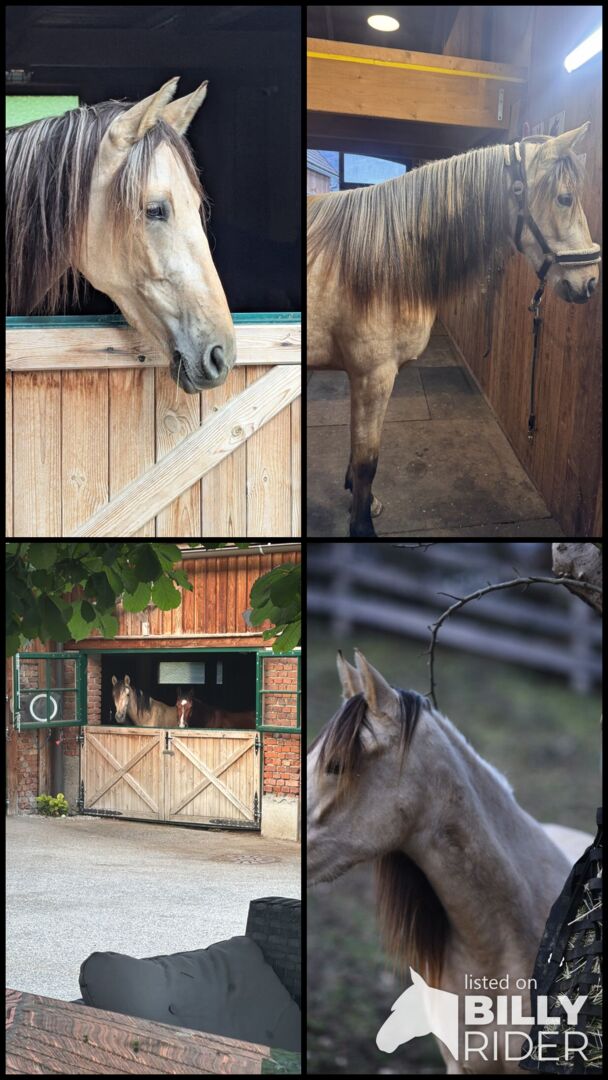 Jag säljer mitt sockersöta PRE-sto i buckskin cream. Hennes namn är Tortola, vilket betyder "sköldpaddsduva" och namnet säger allt. Naturligtvis har hon ANCCE-papper och skulle också vara intressant för avel. Hennes far är en Cremello, liksom hennes helbror. Visuellt har hon en trevlig höjd på ca. 1,56 m och kommer att vara lite över 1,60. Hennes långhår är helt enkelt fenomenalt och skimrar i 3 färger. Hon är en sportig representant för sin ras precis som sin far. Tortola har bra hovar och hennes tänder var nygjorda i början av mars. Hela hennes karaktär är helt enkelt söt som socker. Hon har riktigt fina gångarter och ett solitt nervcentrum. En häst som är lätt att "tända på" men som också klarar sig bra när hon inte behöver göra något. Även hos veterinären, hovslagaren etc. är hon alltid snäll och villig! Hon har varit med mig sedan hon var ett år gammal och är mycket väl socialiserad och van att vara i ett öppet stall med alla raser och åldersgrupper och kan stå upp för sig själv men är aldrig elak! Hon är också mycket robust trots sitt känsliga utseende och jag har inte ens behövt täcka över henne i årets extremt kalla väder. Allt som allt är hon en mycket okomplicerad häst. Hon är alltid 100% respektfull mot människor och har en enorm "will to please". Tortola fyllde 3 år i slutet av januari och arbetas för närvarande regelbundet av mig för hand på skänkelvikning (gå in i hörn, mobilisera, kontra och axel in, bakåt etc.) och longeras, samt tas regelbundet ut i fält som handhäst, där hon alltid och överallt är superfin i hanteringen. Hon är för närvarande blindbockad och flexioner startas. Hon är också redan van vid en dyna på ryggen. Jag tror också att hon verkligen skulle njuta av fritt arbete!