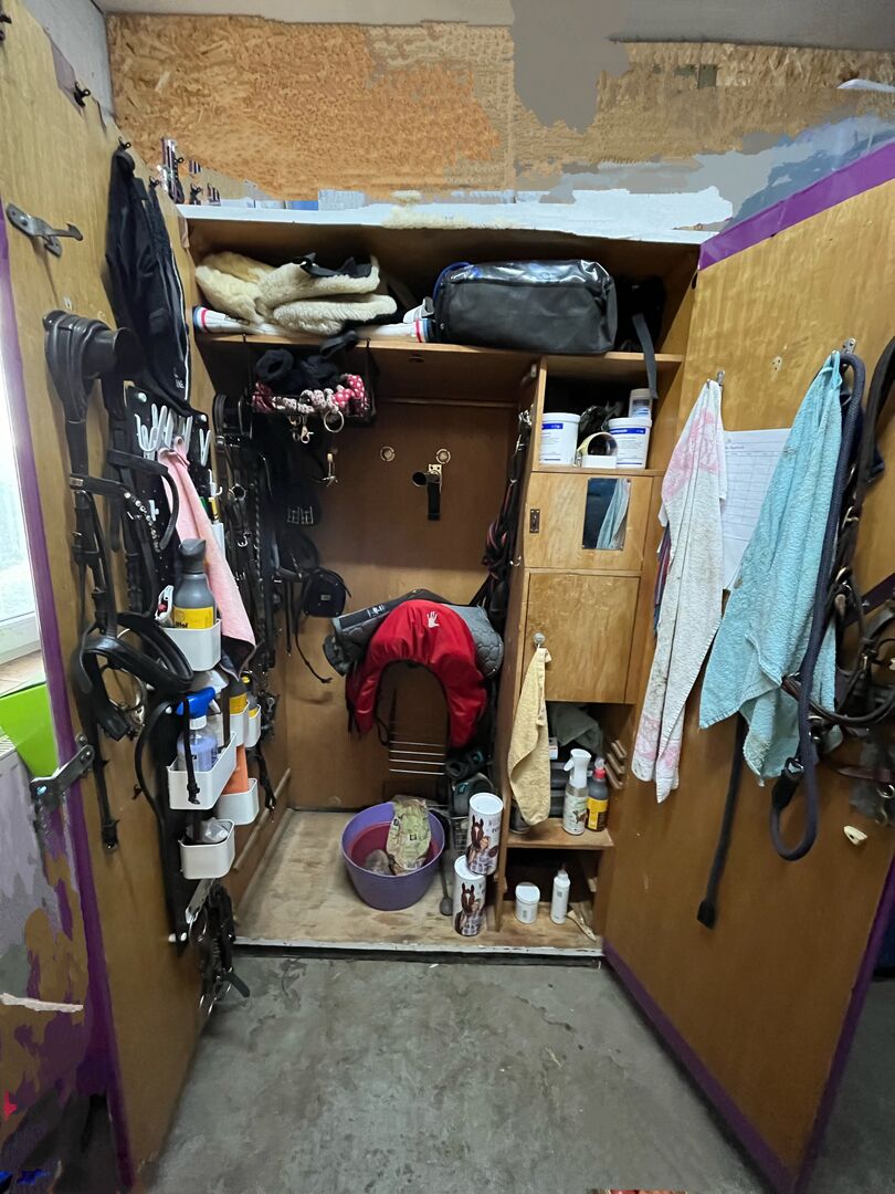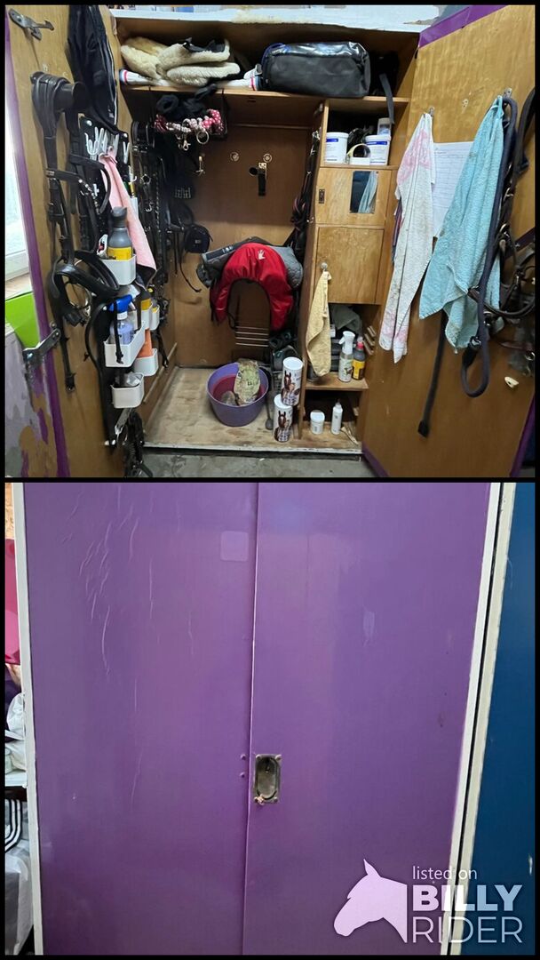 Förvaringsskåp Bundeswehr, sadelförvaringsskåp 200 × 120 × 60 - Vi säljer vårt välbevarade Bundeswehr-skåp, som används som sadelskåp. 1,20 m brett, dörrarna är lila, folierade med glittereffekt. Vi behöver inte längre det på grund av en förändring av stallet. Endast avhämtning, belägen i Lüneburg-området.
