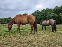 Framgångsrikt Quarter Horse-sto till salu i kärleksfulla händer - Plats: 54668 Echternacherbrück Shez Presidential är ett vackert, kompakt och korrekt byggt Quarter Horse-sto med en förstklassig Pleasure- och Allround-stamtavla (Presidential Oder/Hot Impulse). Hon är född 2010, är sorrelfärgad och har en mankhöjd på ca 160 cm. Stoet är människovänligt, vänligt, öppensinnat och har en mycket sällskaplig och trevlig karaktär i den dagliga hanteringen. Hon är väluppfödd för smide och lastning, regelbundet vaccinerad och avmaskad och barfota. Shez Presidential är hittills frisk, hon har inga kända begränsningar och är 5-panel n / n, GBED n / p testad. I boxen visar hon ibland en tendens att väva, varför hon företrädesvis hålls i ett öppet stall. I hagen väljer hon sina hästvänner mycket noga och gillar inte att dela hage med alla hästar. Hon är helt okomplicerad med unga hästar. Under ryttaren imponerar hon med sina fantastiska gångarter, massor av go och stor ridbarhet, men kräver en säker ryttare. Hon är en erfaren instruktör i Western Pleasure och Western Riding, rids också i terrängen och är bekant med strandridning, bland annat. På grund av hennes inställning till hoppning bör hon inte längre visas eftersom hon inte längre tycker om det. Shez Presidential har framgångsrikt visats i sporten och har fått 102 AQHA Performance Points i Western Pleasure och Western Riding samt 2.700 dollar i LTE. Hon vann flera kretsmästerskap, var Reichert Futurity Champion Limited Open och uppnådde många andra placeringar. Hon är också en mycket bra mamma och hade ett fantastiskt föl av Lazy Loper 2024, som också är till salu. Detta speciella sto kommer endast att säljas till de allra bästa, kärleksfulla händerna där hennes karaktär och kvalitet kommer att uppskattas.