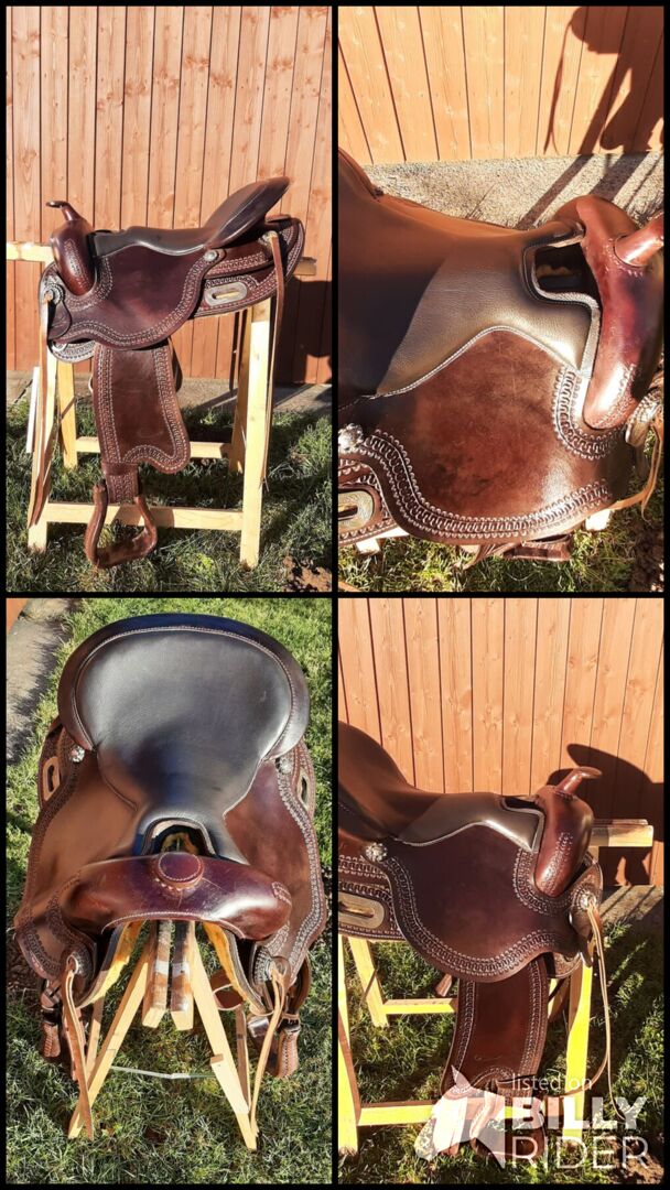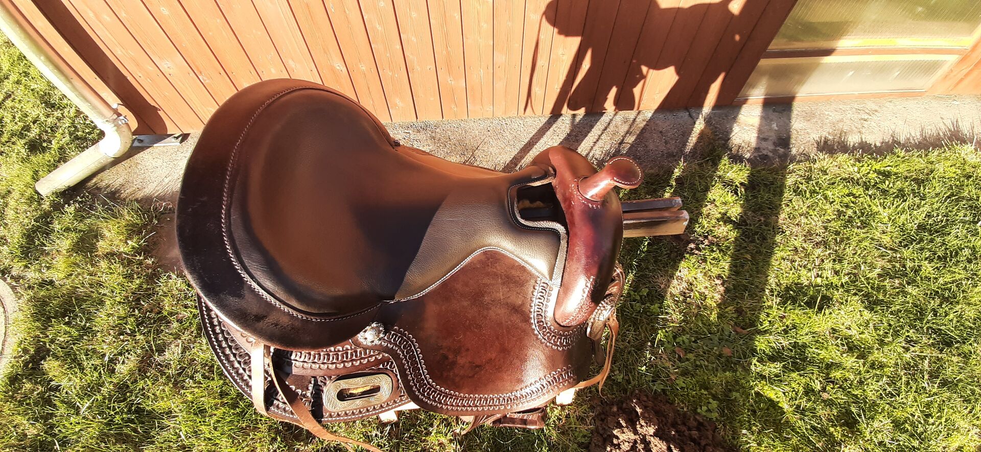Freemax Western Sadel Kort 16" - Jag säljer min begagnade och mycket välbevarade Freemax Büffel trädlösa sadel gjord av högkvalitativt läder med en flexibel inre struktur gjord av speciellt sprayskum. Detta möjliggör en bra anpassning till hästens rygg och fördelar ryttarens vikt väl. Sadeln förblir stabil även när den är i rörelse. Tack vare de korta kjolarna passar den här modellen bra för korta hästryggar utan att rörelsefriheten inskränks. Sadeln är för närvarande utrustad med en gaffel i storlek 3, som är utbytbar och därför kan anpassas till olika hästar. Färg: choco (mörk) Sits: slätt läder. Total längd ca 61 cm Sitsstorlek: 16" Sadeln säljs på grund av ett nytt köp.