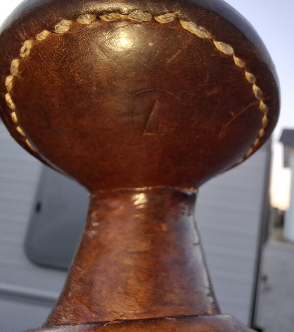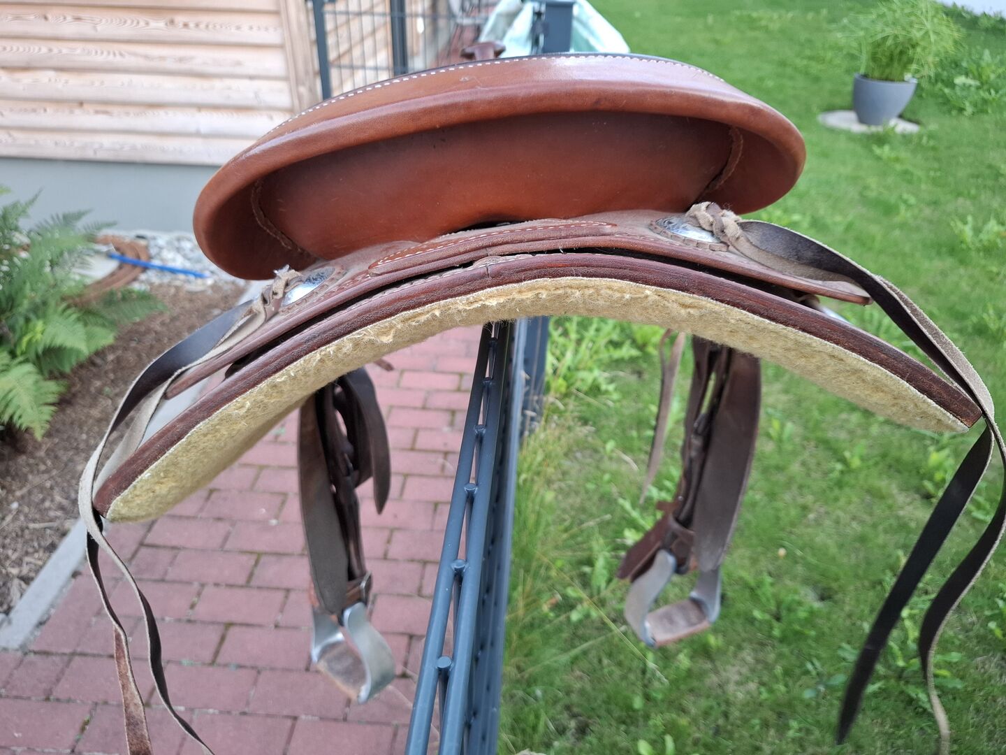Sadeln är fortfarande den gamla modellen, men med det nya gaffelsystemet. Den monterades av en Freemax sadelmakare. Det är en 4-punktsgaffel (kilar är för närvarande monterade, så gaffel 3,5) med en skålbredd på 19 cm.
