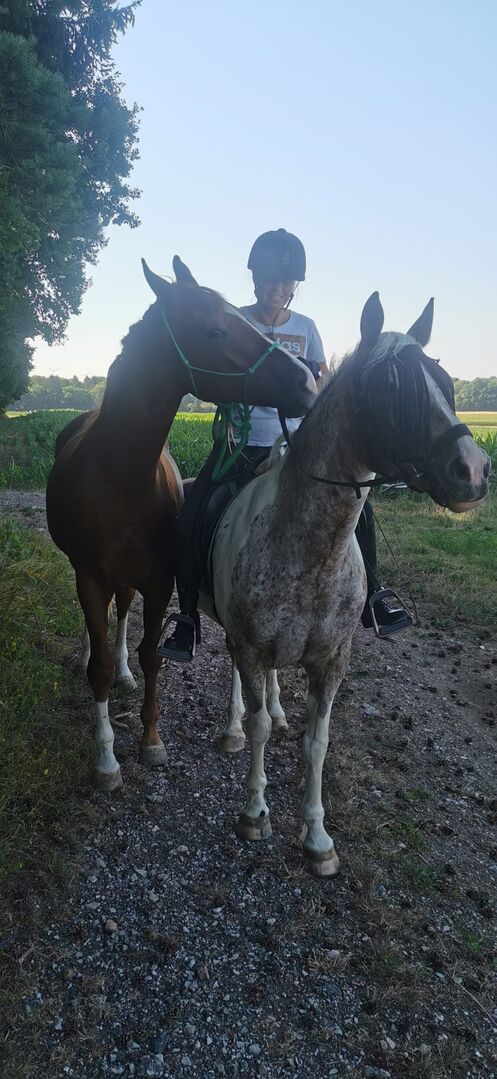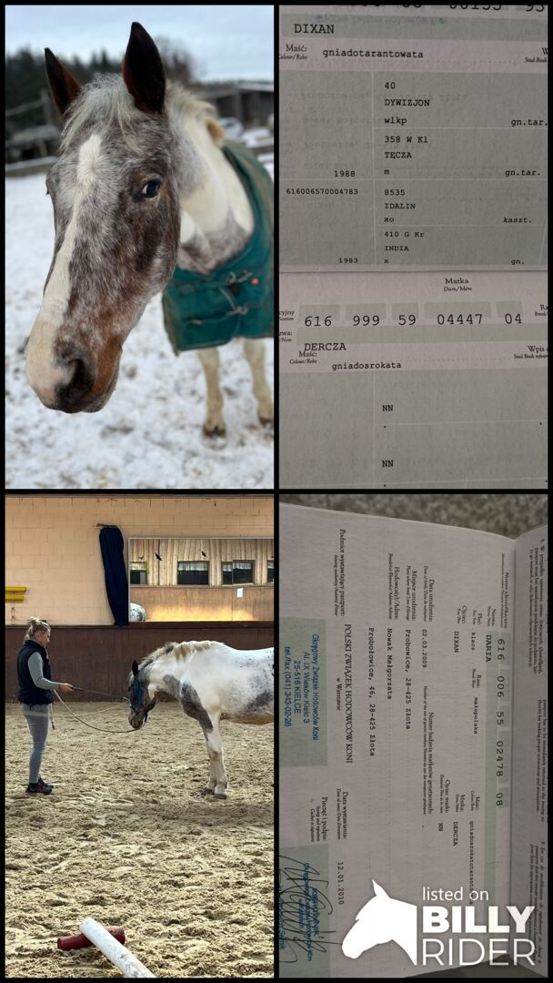 Fritidshäst / ridbara sidomän - Daria har ett polskt pass. Hon säljs som en fullt ridbar orderer eftersom hon kan vara mycket envis och bitchig under ryttaren. Hon gillar att gå ut, även ensam, och tycker om markarbete och små hopp. I arenan är hon dock ganska impulsiv, omotiverad och testar ryttaren. Hon är skodd fram på grund av markens beskaffenhet. Hennes tänder gjordes i maj och hon har just haft en check-up. Hon tenderar att hosta under pälsbytet, men detta kan hanteras bra med saltlösningsinhalation och utan medicinering. Det är också mycket bättre med vått hö. Denna hosta begränsar henne inte heller. För närvarande är hon helt symptomfri. Hon har varit hos mig i 7 år. Men jag kan inte längre göra henne rättvisa på grund av tidsbegränsningar. Jag ger bara bort henne till ett öppet stall. Hon är i en liten flock av ston och är ganska hög i rang. Transport kan tas över. Tillbehör kan köpas.
