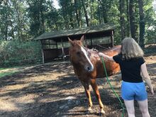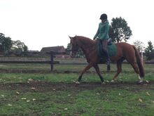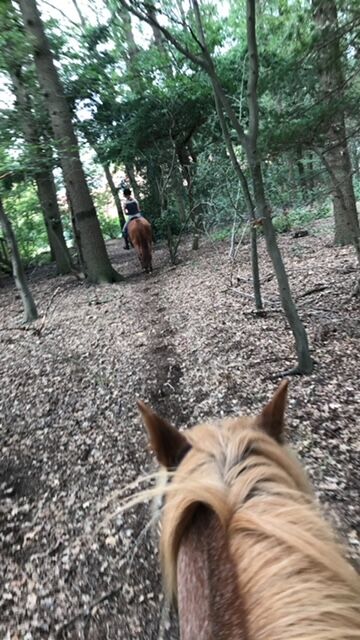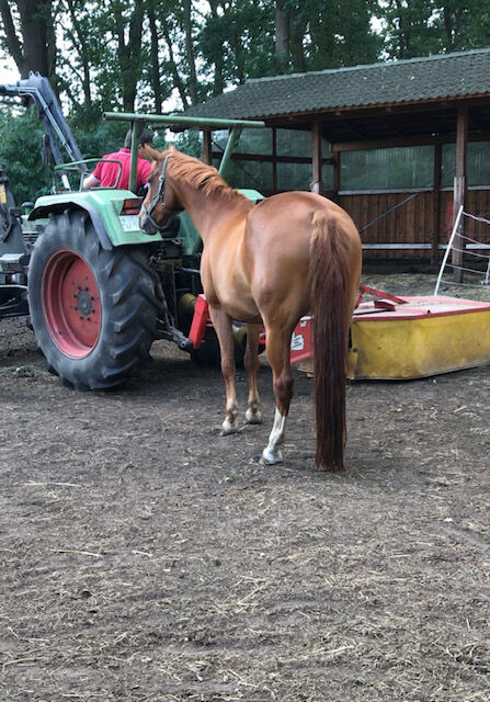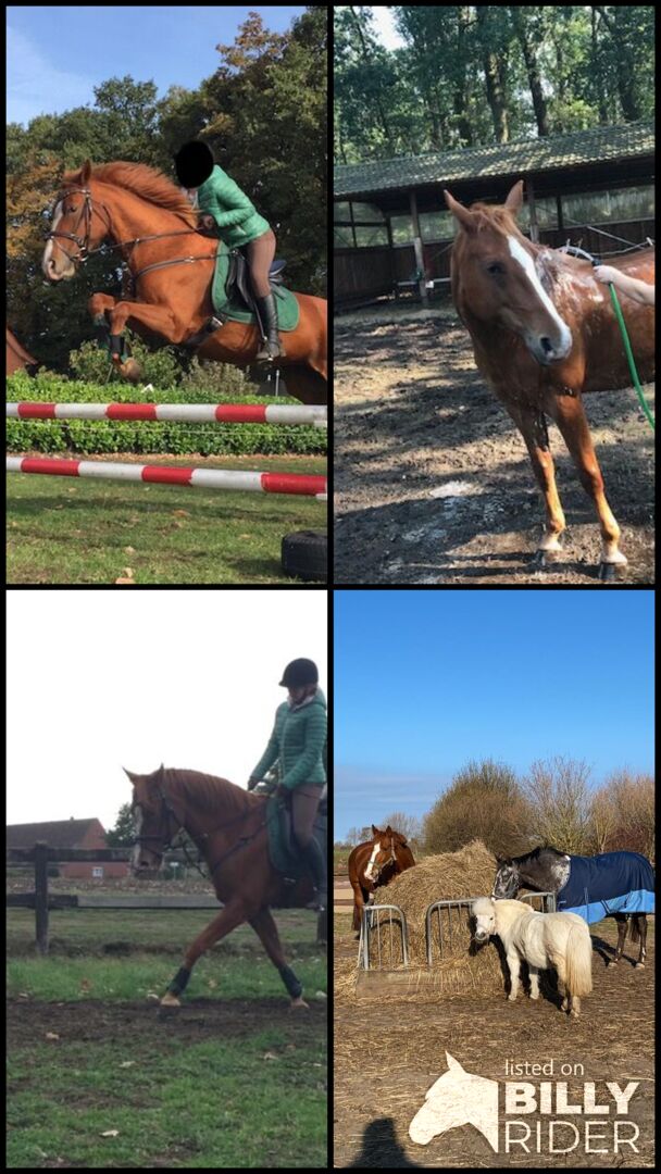 Fritidshäst : Vackert kastanjemärke (1,57m) - Det här stoet söker ett trevligt nytt hem som fritidshäst. Hon är 157 cm lång och täcker även vuxna bra. Hon är trevlig att hantera och bra att rida, men behöver en tydlig och säker hand. Går utan problem ut på fältet med två hästar utan problem, modig och orädd. Traktorer, hundar och barn är inga problem, Barhufig - vänligt inställd till smeder. Av "flockrelaterade" skäl har hon varit hos min syster i Holstein sedan förra sommaren. Inget nödköp - plats före pris. Små videor finns tillgängliga på begäran.