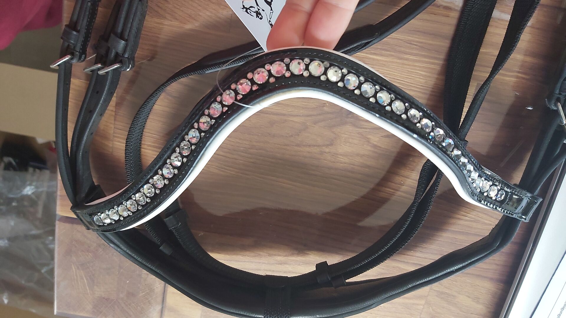 Full Bridle Bridle ny svart rhinestones lack - Ny oanvänd eftersom den är alldeles för stor Svart, pannband med strass, rwithalfter med lack Returnering tyvärr inte möjlig