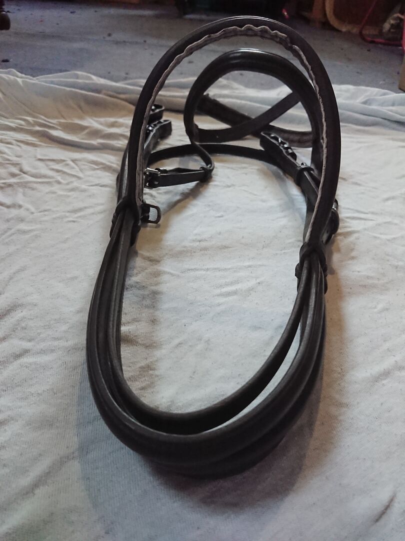 Gammalt märke dubbel träns VB/WB svart - Gammalt dubbeltygel utan tyglar, svart, delade kindpartier, välvda, beslag i rostfritt stål, smalt slätt nos- och pannband. Ursprungligen vitt underlag, men nu missfärgat grått. Enkelt och tidlöst, välskött läder, mjukt och helt OK för sin ålder och redo för omedelbar användning. Det är en Marketrense, vilket också märks på kvaliteten, men tyvärr vet jag inte längre vilket märke, eftersom emblemet på pannbandet har gått förlorat. ....