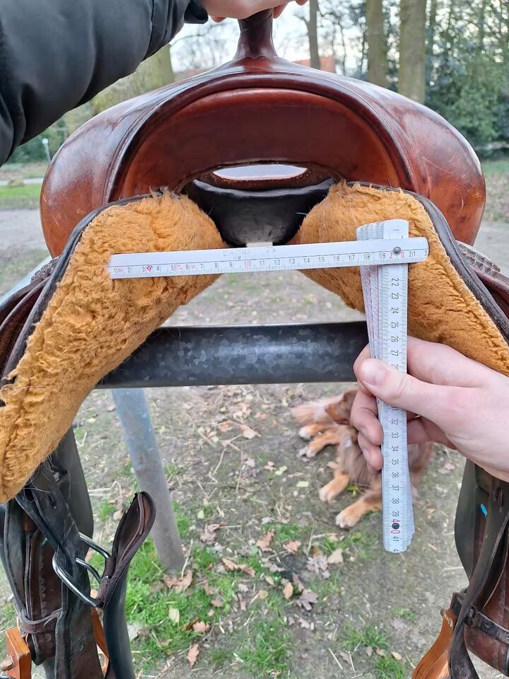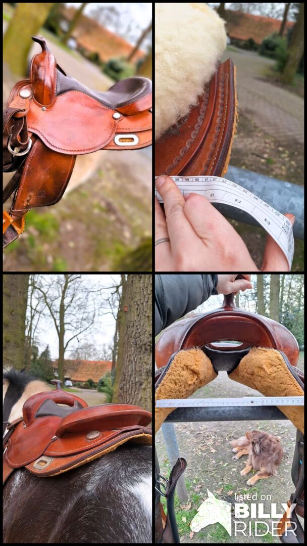 Garland western sadel bred, kort - Western sadel från Garland till salu. XFQH, men inte för de allra mest extrema ryttarna, då den är för smal vid axeln. Måtten kan tas från bilderna, sitsstorlek är 16". Monterad på ett sportigt Tinker-sto utan manke och rund avsmalning. Dubbel riggning och sadelmakaren monterade även en tredje riggning framtill. Han har en bekväm gel-sits.