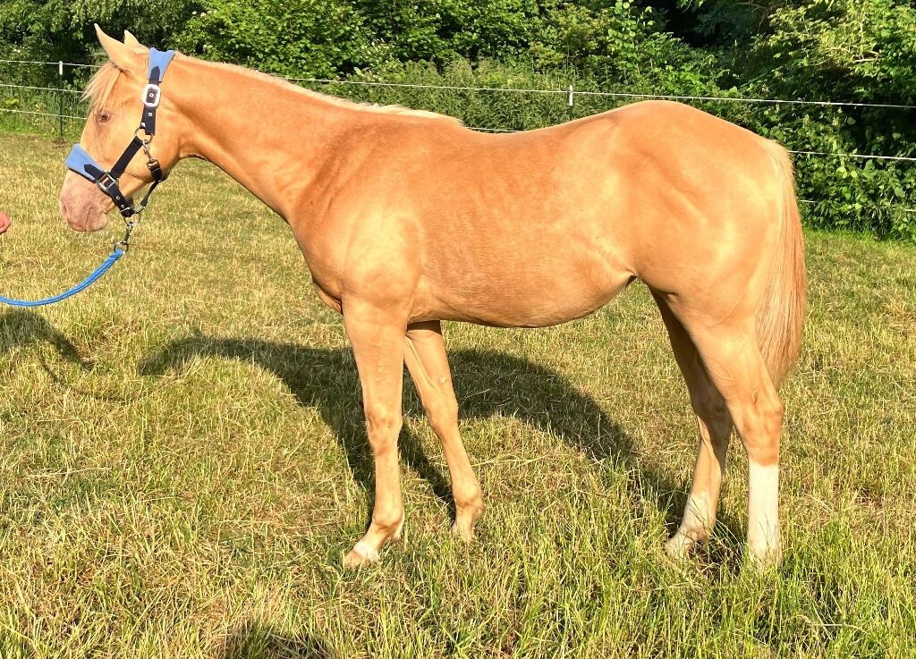 Gold Champagne-färgat Quarter Horse-årssto med bra allround-avkomma. - Letar du efter en blickfångare i en speciell färg? Då är Lady exakt rätt. Quarter Horse-årsstoet har den speciella färgen gold champagne (heterozygot för champagne). Hon förtrollar inte bara med sin färg, utan också med en korrekt konformation och en mycket öppen karaktär. Hon är född 7.2022 och kommer att ha en beräknad sluthöjd på 150 cm. Lady växer upp i ett öppet stall i en åldersblandad besättning. Hon kan allt som man bör veta i hennes ålder. Binda upp, bli berörd överallt, ge hovar, traktorer, barn, hundar, hovslagaren, veterinären och hon kan lastas. Stoet är vänligt och nyfiket mot alla. Hennes framtida användningsområde kommer att vara inom allroundområdet, oavsett om show eller fritid. Hon kommer att överlämnas med fullständiga papper och DQHA hästpass. Båda föräldrarna kan ses på plats.