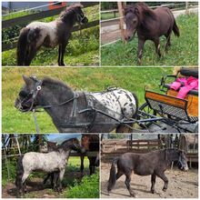 Schabracktiger sto och svart sto 95cm och Few Spot hingst årling ca. 100cm, känner barn, vägtrafik, evenemang från födseln. Mamma har ridit, kört, ridit och terapiridning.