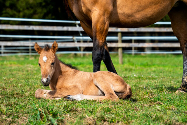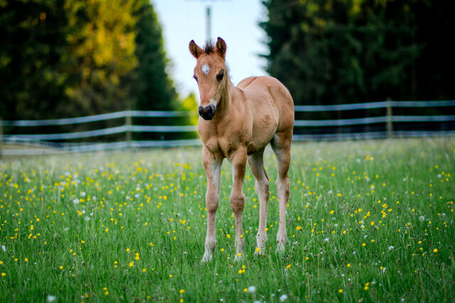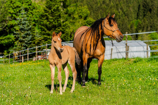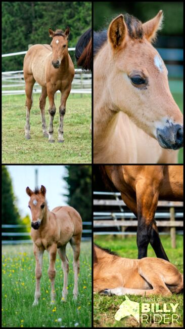 Grundstammad, vacker Quarter Horse-hingst - Plats: 53949 Dahlem QB Peanut King Sail - lovande, vacker Quarter Horse hingst, född 2025, övertygar redan med sin vackra och stabila konformation, sin stora färg Dun och sin härliga natur. Han kommer att nå en slutlig höjd på ca 150 cm. Hingsten är till 92% avlad med foundation. Peanut kommer att växa upp med andra unghästar i ett öppet stall under optimala förhållanden, är redan bekant med veterinären och hovslagaren och kommer att vaccineras och avmaskas i enlighet med sin ålder när han överlämnas. Hingsten är 6-panel n/n. Han är gosig, nyfiken och mycket människoorienterad i daglig kontakt. Han kan fölets ABC, är haltertränad och hanteras dagligen. Hans stora natur och goda rörelser gör Peanut till en lovande unghäst - både för fritid och sport. Han kommer att säljas med AQHA- och NFQHA-papper.