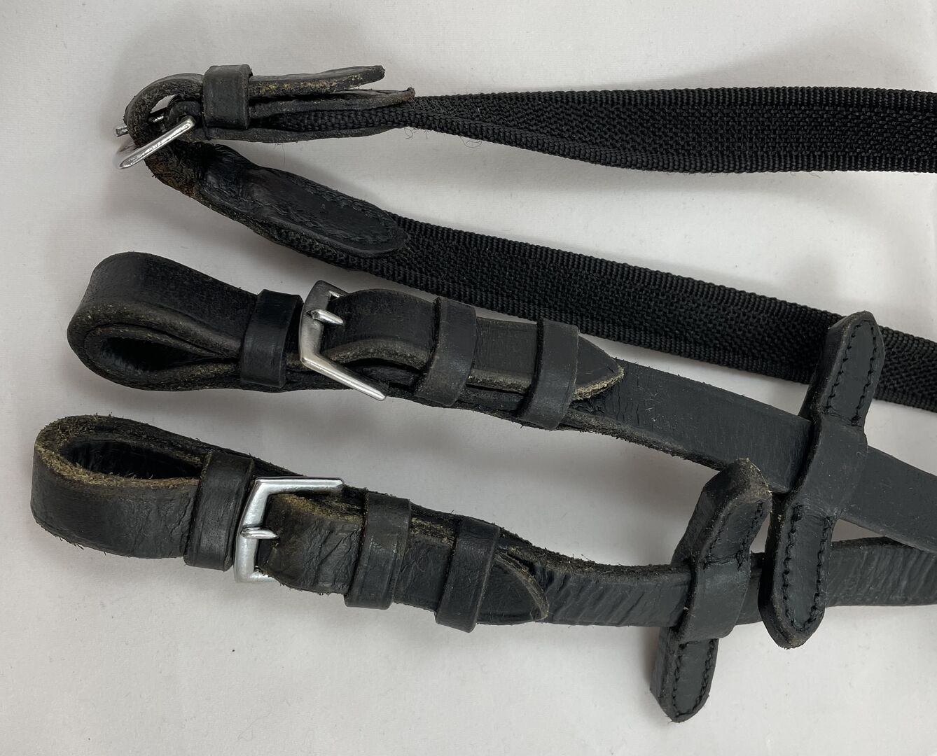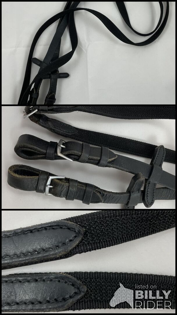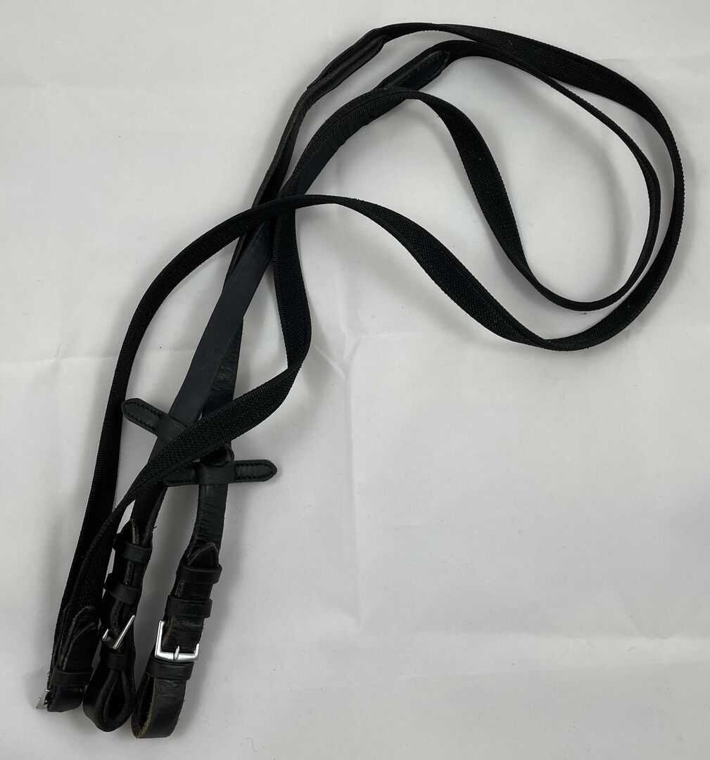 Säljer mina sällan använda svarta gummiremmar, märke okänt, troligen Loesdau. Mjuka, smidiga gummitillar utan stänger för optimalt grepp. Med lädermartingalglidare på läderänden och silverfärgade beslag.
