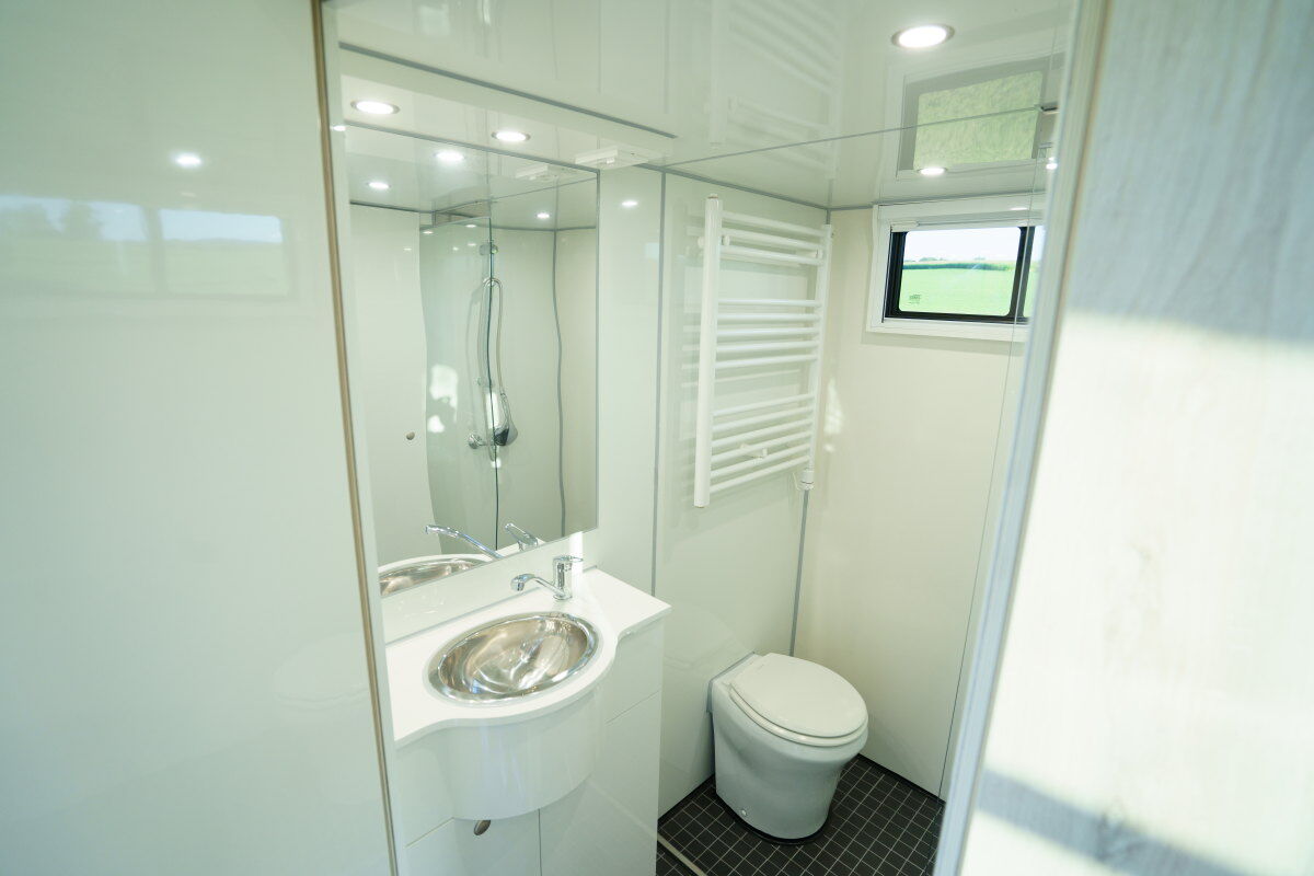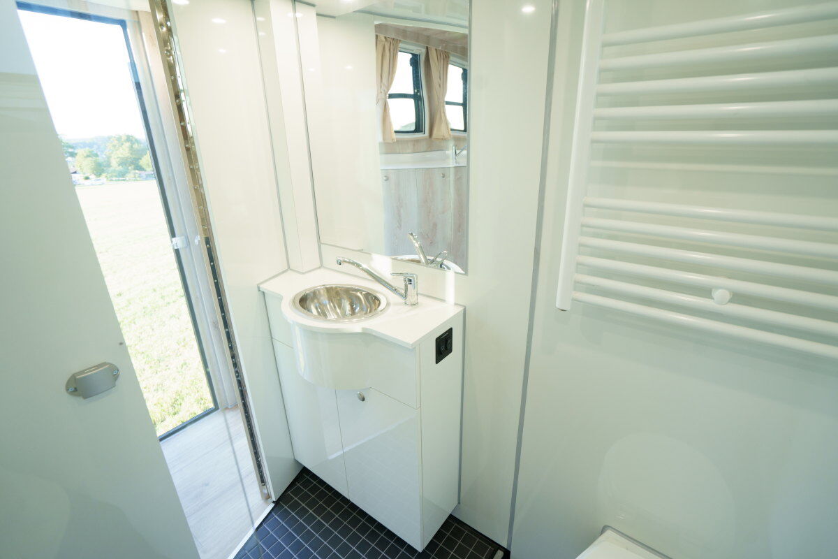 4-5 hästplatser, bak- och sidoramp med rampbegränsare, videoövervakning, takluckor, elektrisk fläkt, nattkörljus, kabelvinsch, flyttbara vadderade skiljeväggar med vikbart bettskydd, öppningsbart fönster, filtställ ovanför hästens korsrygg