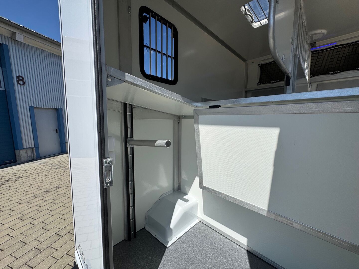 Sadelförvaringsfacket kan nås via bakdörren med hjälp av ett viksystem. Detta gör att du kan mata eller tränsas hästarna när rampen är stängd. I sadelkammaren finns ett förvaringsställ till höger och 2 sadel- och tränshållare till vänster.