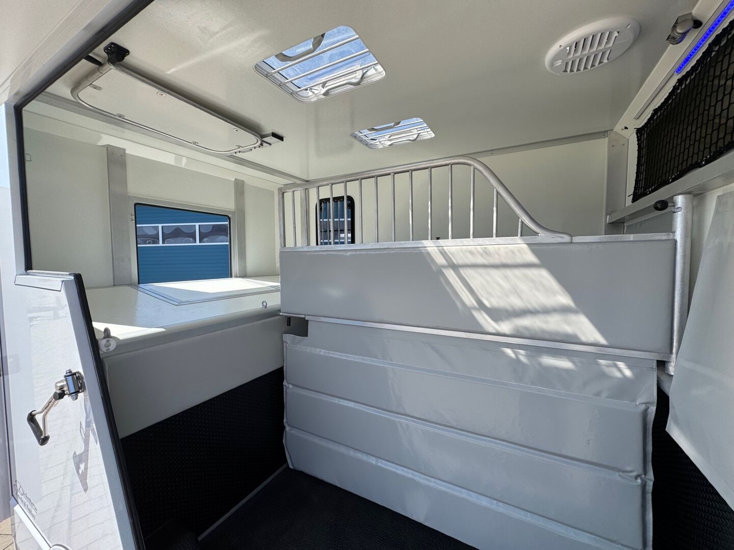 En elektrisk fläkt, 2 takluckor och 2 nedfällbara fönster på hästhuvudena ger luft och ljus i hästutrymmet. Vårt kamerasystem gör att du kan övervaka hästarna under resan och det bakre området när du backar. Vita och blå LED-lampor ger rätt belysning i lastbilen både dag och natt.