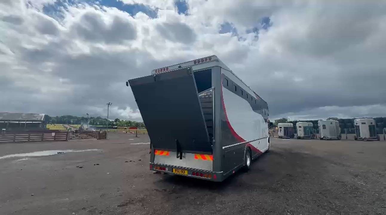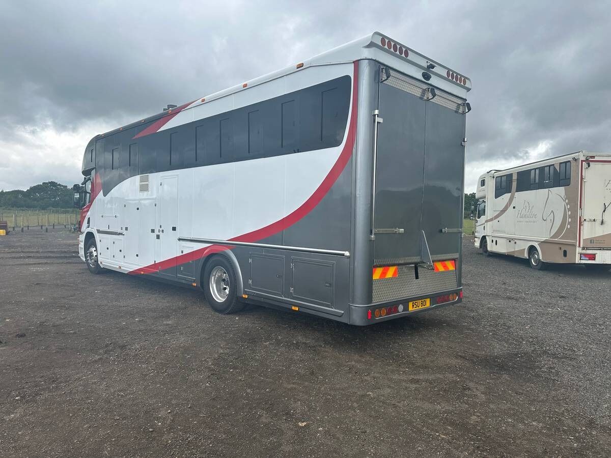 Type Horsebox Manufacturer Scania Model Name P310 Weight +7.5t Facilities Tack locker, Skirt lockers, Water tank, Toilet, Shower, Heating, Generator, Electric hook up, Hob, Cooker and TV Sleeps 4 Number of Horses 5 Living Overnight Condition Used Description Overview • 2006 Scania P310 18,000 Kg Chassis • Coach built by Annard in 2017 • Stalled for 5 • Electric slide out • Underfloor storage Chassis and Engine • 2006 Scania P310 4X2 • Engine size:8970cc • Gross Weight: 18,000 Kg • Mileage: 47,873 Miles • Manual Gearbox • Rear air suspension • 310 BHP • Heated Mirrors • Cruise Control • Adjustable Drivers Seat and steering wheel Living • Sky Light • C Shaped Leather seating-converts into a double bed • Double bed above drivers compartment • Fridge with Freezer • 32” TV • Spniflo Caprice MKIII Cooker and hub • Russel Hobbs Microwave • Fitted worktop with built in sink • 240V Sockets • LED Lighting • Electric slide out • Spotlights • Dining Table • Multiple fitted storage compartments • Wardrobe Bathroom • Shower • Hand Basin • Toilet Horse • Stalled for 5 • Aircon • Tie rings • Rubber flooring • Electric rear loading door Exterior • Custom black, red, white and grey livery • Under floor storage • Tinted windows • Large tack lockers • Alcoa Durabrite Alloys • LED Taillights