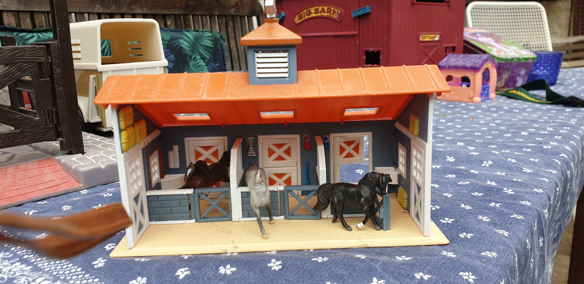 Hästleksak Fillyturm, tvättplats, Barbie-vagn, Ladugård, Schleich släpvagn - Flera hästleksaker till salu Ladugård ( från USA) 30 Euro Filly torn +5 Fillys ( 40 Euro) Dröm om ett stall-hus ( 20 Euro Släpvagn från Schleich 10 Euro Barbie vagn 15 Euro För frågor vänligen maila eller 015127500037