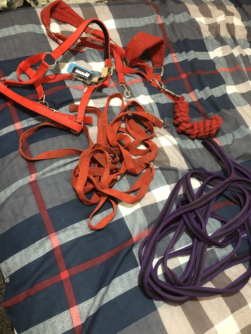 I have horse stuff for sale 2 full headcollars red one with lead rope Saddle 17” black med/wide Breaking bit 5.5 Hoof clay Hoof medical oil Purple shampoo great for grey horses Grooming box with brushes Riding hat comes with bag 56cm Roller with side reins Training aid Two girths one black which is 42” the other one is brown and 44” Red Exercise bandages Fly veil red New hoof oil Lunging cavason
