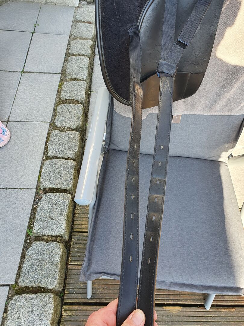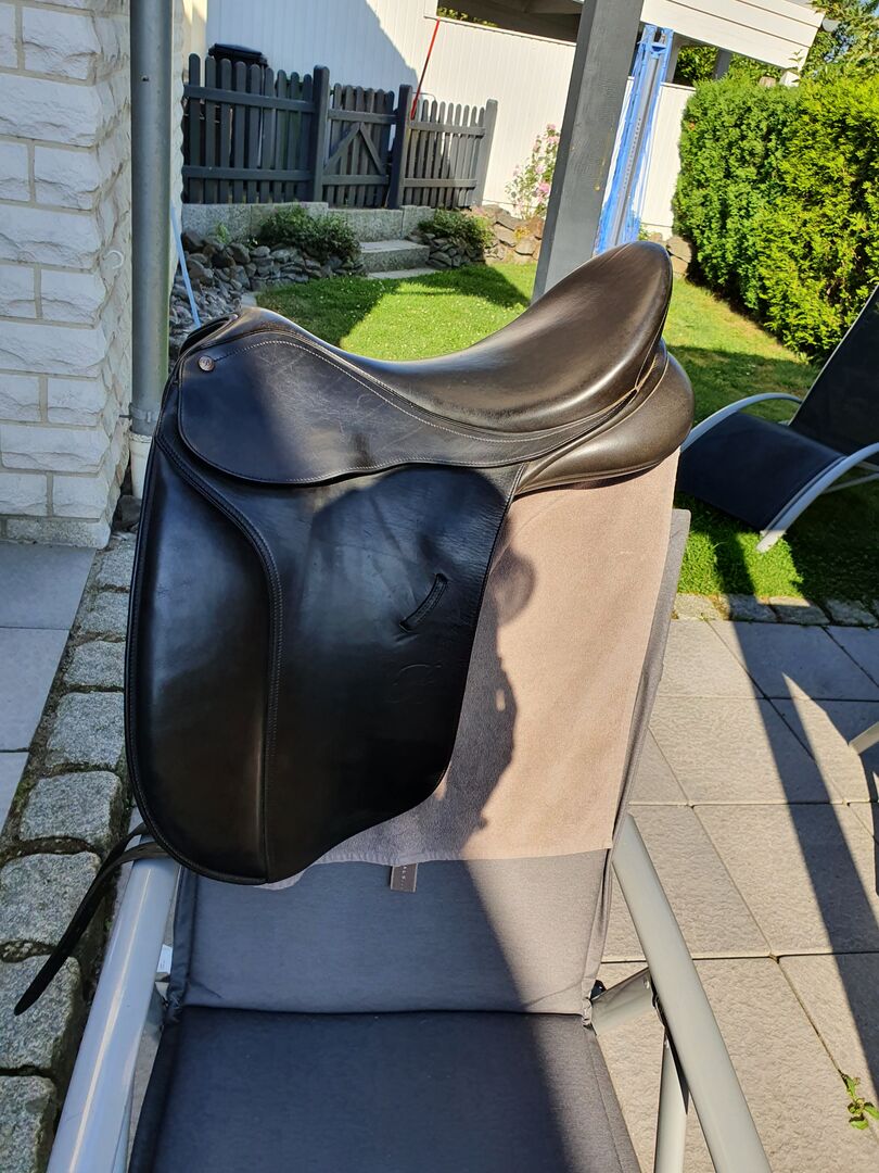 Hästsadel - Detta är en begagnad Bates dressyrsadel.Den är i mycket gott skick, vilket kan ses på bilderna. Sadeln är 17,5", bredden på magsäcken är 31", bredden på magsäcken är normal (blå magsäcken finns för närvarande i sadeln, en vit magsäcken ingår också), sadeln stoppades om för ett kvarts år sedan. Sadeln kan provas mot en deposition. Hämtning eller frakt är möjlig mot en extra avgift.