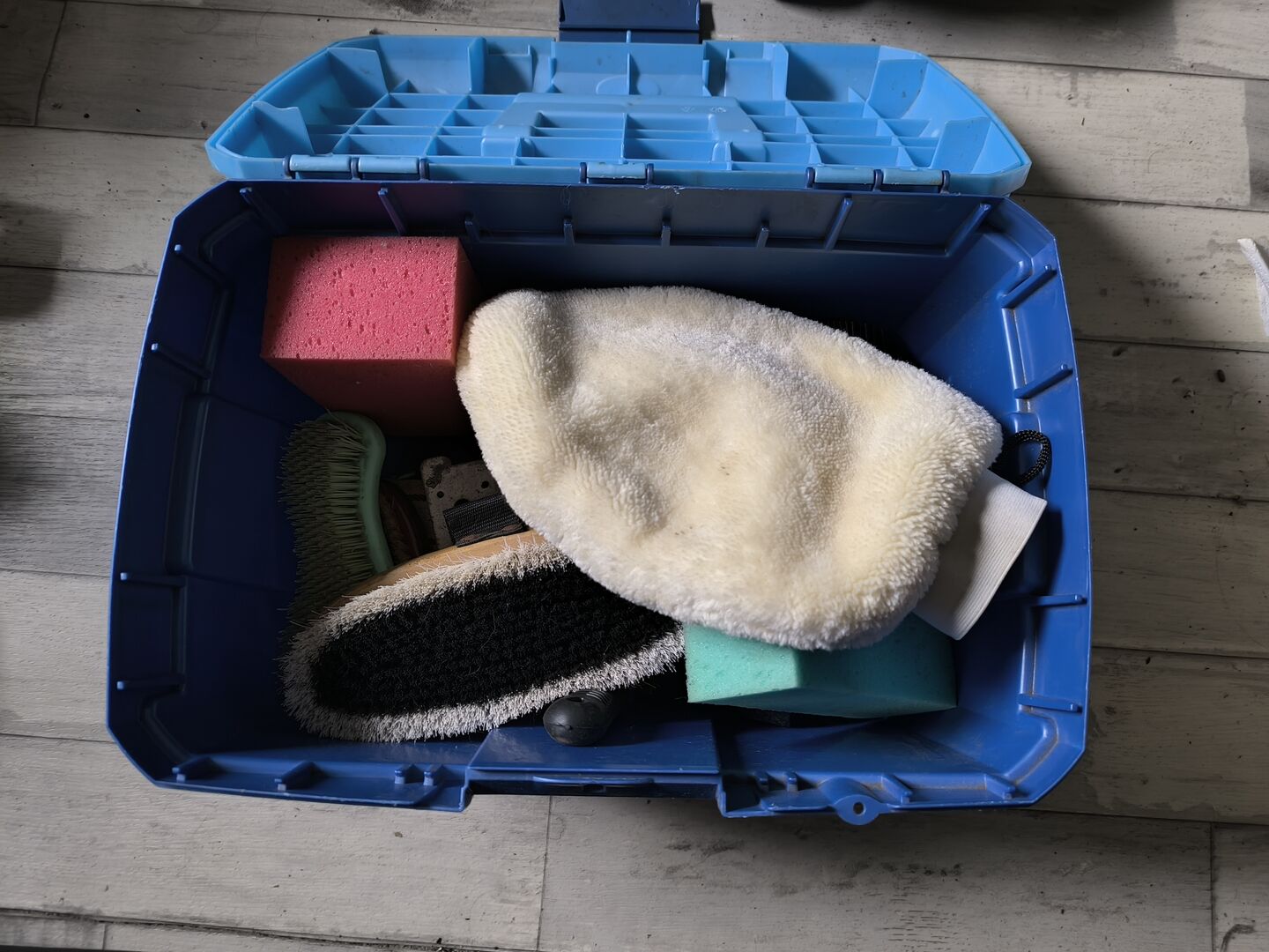 Hästskötselbox från Kerbl inkl. tillbehör - Jag erbjuder en mycket välskött städlåda inklusive tillbehör. Allt är i nästan bra och välskött skick. Jag kan skicka mer detaljerade bilder om så önskas. Kommer naturligtvis att rengöras igen före avsändning.