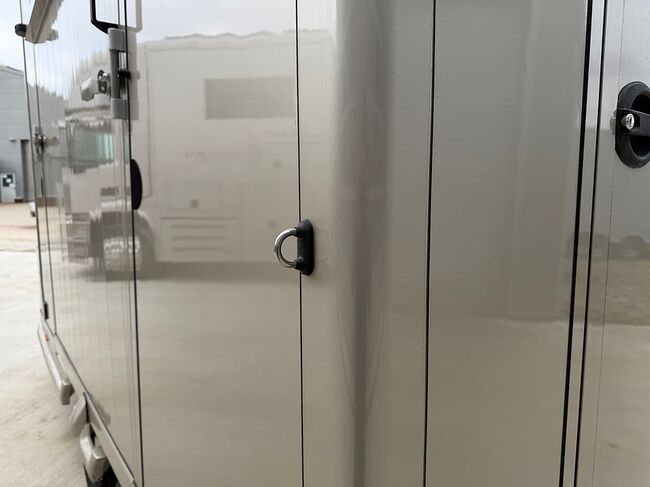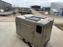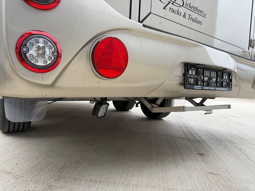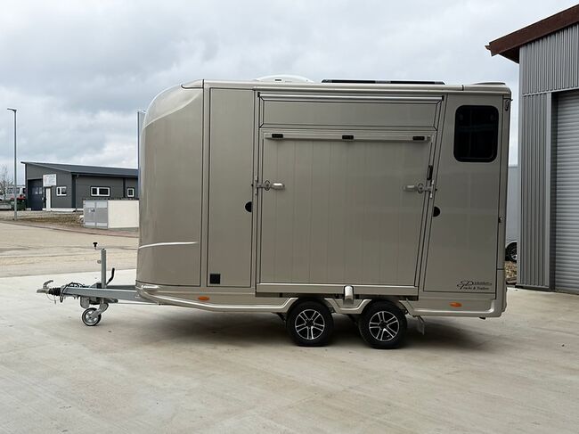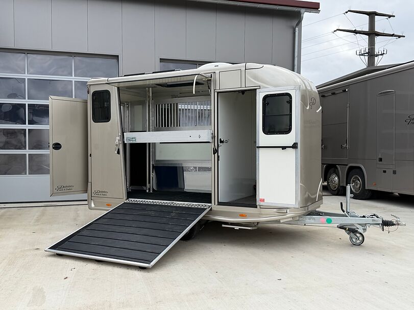 Golvkonstruktion av aluminiumprofiler med limmade på ett höghållfast gummigolv, 30 mm tjocka, helt isolerade sido- och takpaneler, aerodynamisk frontdesign låsbar sidodörr till höger med fällbart trappsteg, sadelkammare, fällbar säng (nödsäng), 2 filtställ integrerade i framväggen, svängbar sadelhållare för 2 sadlar, surrningsöglor för sadelkammare, många träns- och kappkrokar två sidoramper med ventilationslucka för att lasta varje häst individuellt, idealisk trailer för hästar med lastproblem som först kan bäras genom trailern, 2 droppfönster vid hästarnas huvuden, ytterligare ett längsgående skjutfönster, stor taklucka, elektrisk takventilation kan kopplas från sadelkammaren, mittvägg med höga stänger och transparent gardin, hingstvägg vid hästens huvud, plank vid rampen, stor ytterdörr bak, två mycket stabila hingstväggar vid bakdörren som var och en ger individuell åtkomst till båda hästarna
