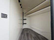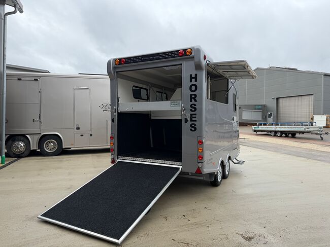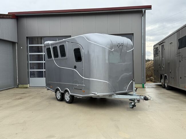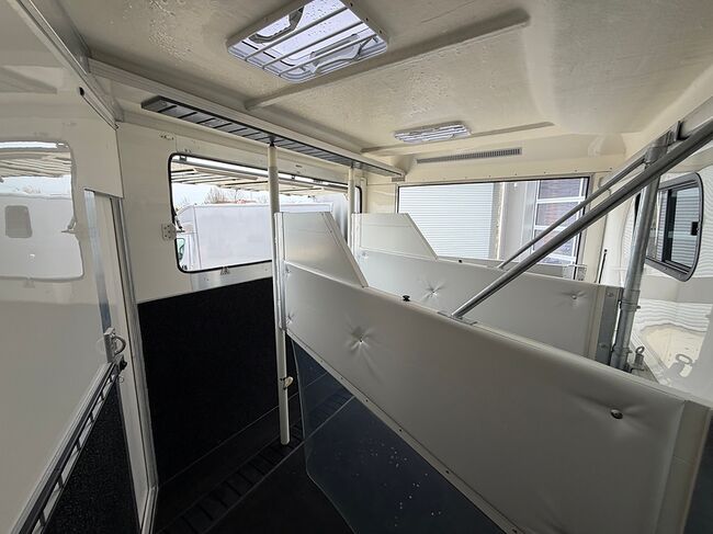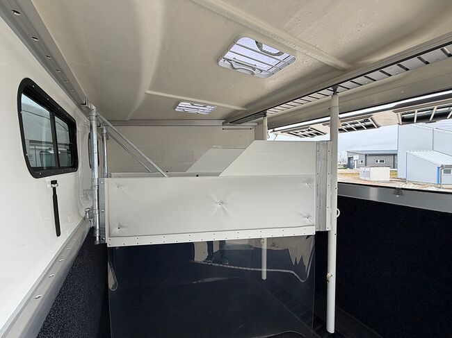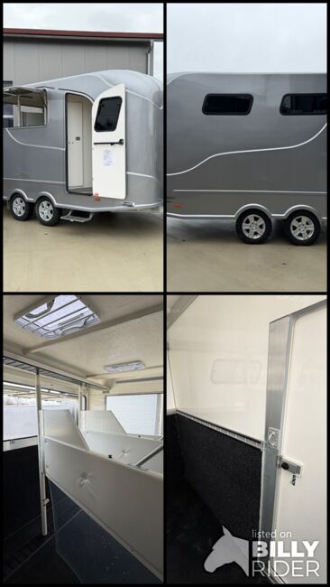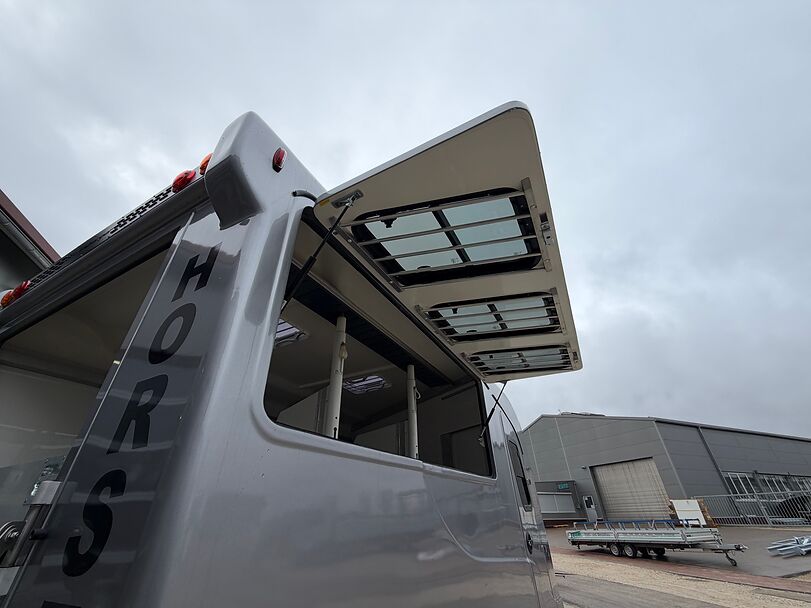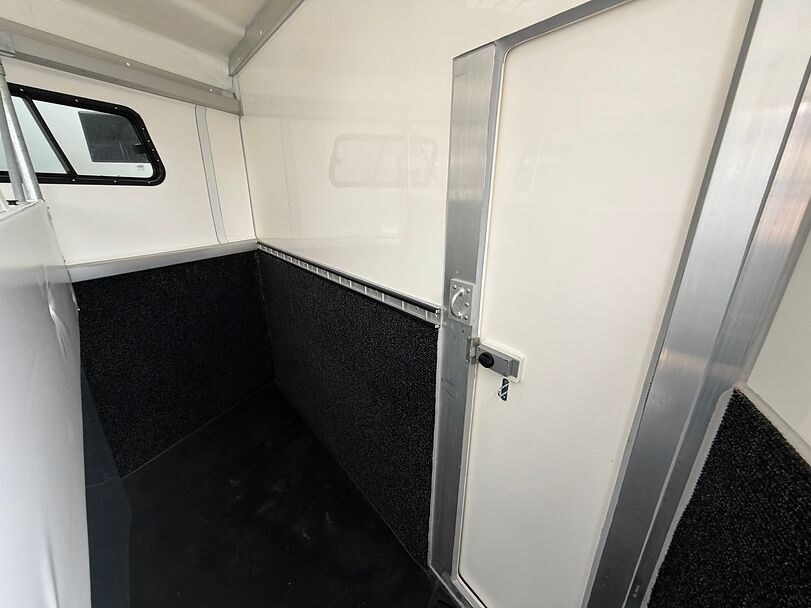 Golvkonstruktion av aluminiumprofiler med limmade på ett höghållfast gummigolv, 30 mm tjocka, helt isolerade sido- och takpaneler, aerodynamisk frontdesign Låsbar sidodörr till höger med fällbart trappsteg, sadelkammare, 2 filtställ integrerade i framväggen, sadelhållare för 2-4 sadlar, surrningsöglor för sadelskåp, många träns- och kappkrokar 3 droppfönster vid hästhuvudena, komplett klaff med 3 fönster som kan öppnas uppåt, två längsgående skjutfönster, två takluckor, två mittväggar med transparenta gardiner, planka på rampen