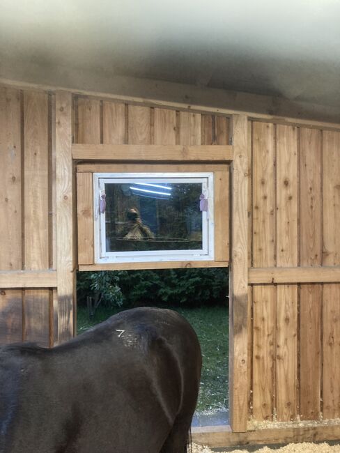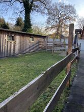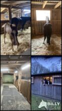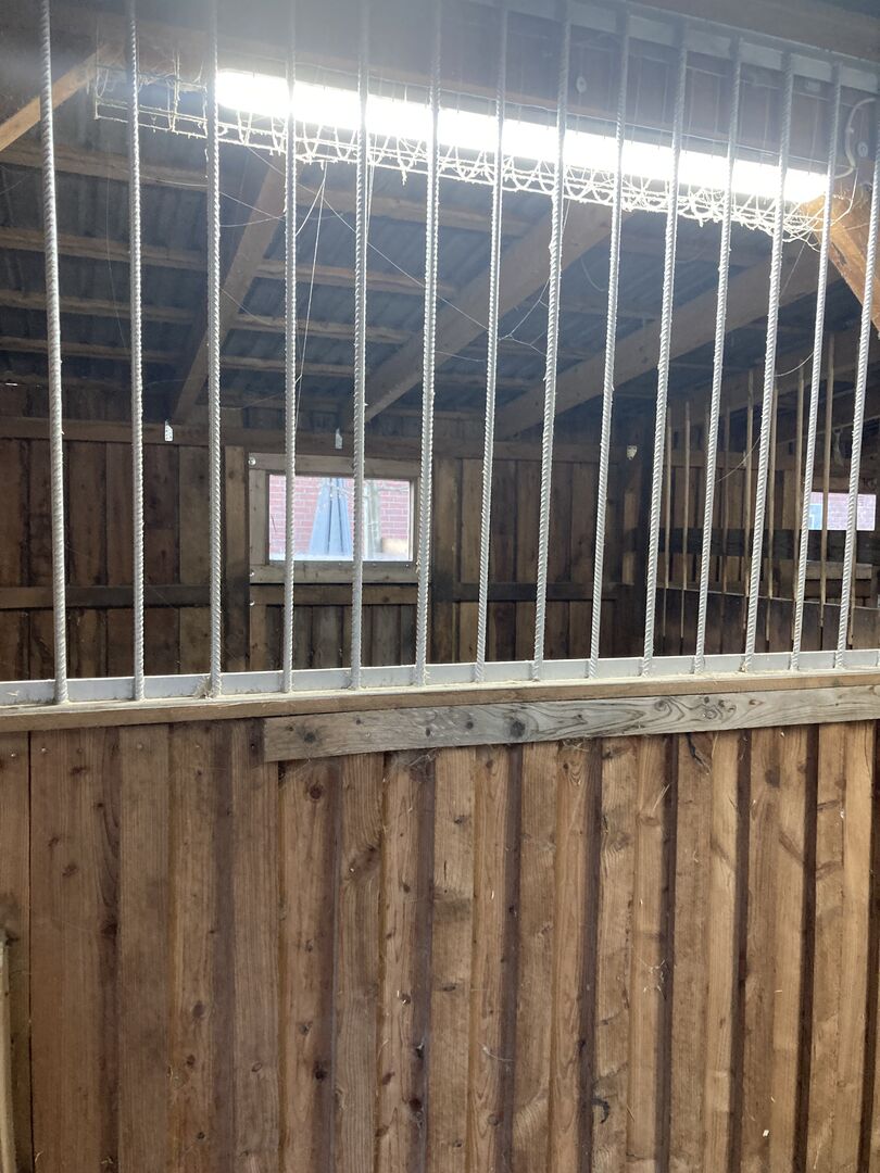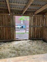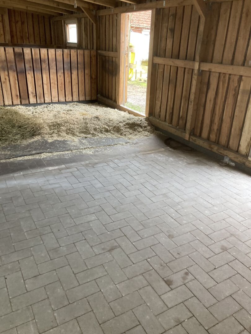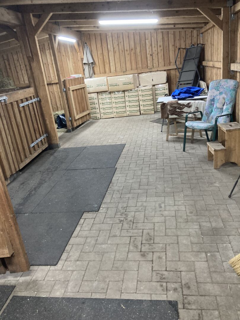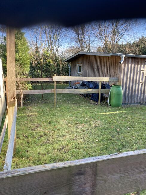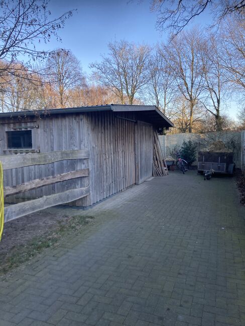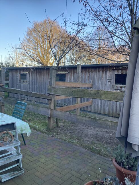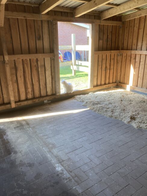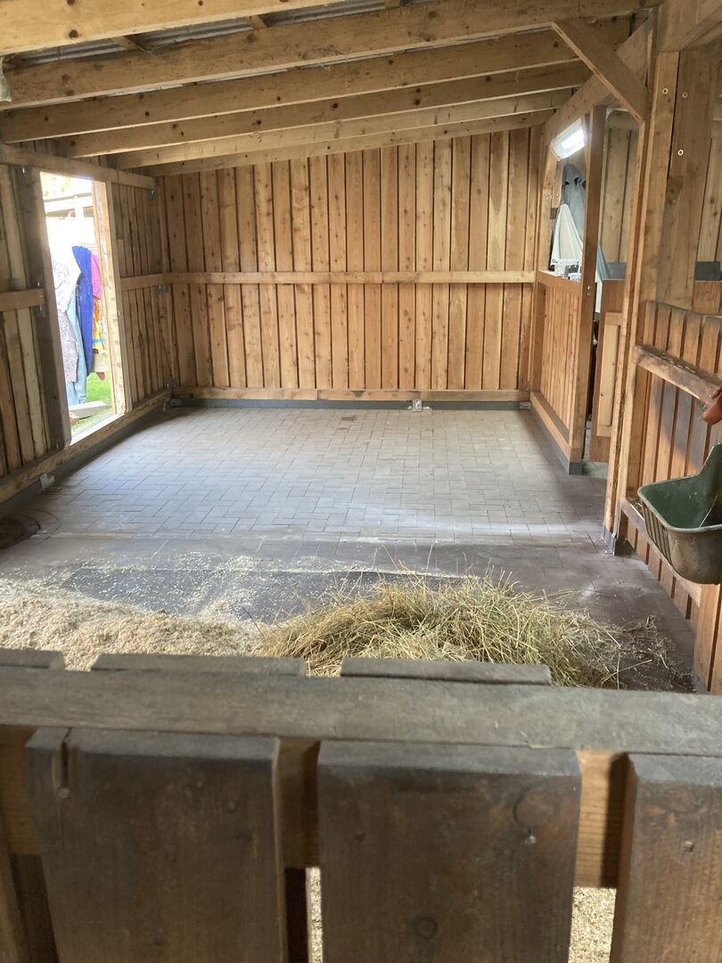 Häststall Beteshage Alpacastall - Häststall av robust lärkträ av hög kvalitet för upp till 6 stora hästar, vardera 3,50 x 3,50 m. Inredningen kan skräddarsys. Lämpar sig även som öppet stall och beteshage. 3 specialanpassade ponnydörrar med säkerhetsglas för ökad komfort för hästarna. Ett ponnystall med cloche-dörr. För närvarande en stor box, t.ex. som fölningsbox 3,50 m x 7 m. Trapetsformad plåt med droppskyddande beläggning. Byggd i moduler med punktfundament. Ljuslister ersatta av fönster. 3 inre boxdörrar solida och generöst tilltagna. Säljs på grund av omlokalisering. Stallet bör demonteras inom 2 månader. Yttermått ca 7,60 x 10,80 meter. Konstruktionen av trästallet garanterar frisk lufttillförsel hela tiden.