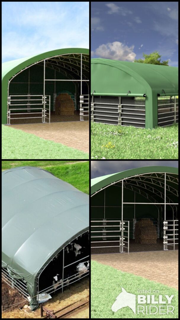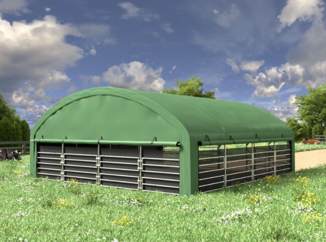 Fördelar på en blick: storzügige 10x10 m Nutzfläche, Premium-Ausführung für den ganzjährigen Einsatz, robust PVC-Plane 900 g/m², UV-Schutz 50+, hohe Reißfestigkeit, stabile feuerverzinkte Stahlkonstruktion mit doppeltem Traversenrahmen, höga rullbara sidor för bättre luftcirkulation, mycket stor plats för större djur, snabbt montage, mobil och flexibelt användbar, idealisk som underrede, pressplats, viloplats eller lageryta.