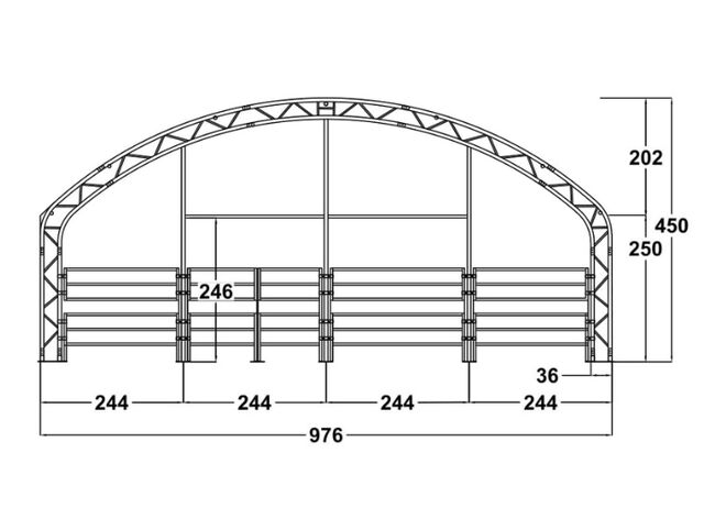 Med en bredd på 10 m, en längd på 10 m, en höjd på 4,50 m och en sidoväggshöjd på 2,10 m erbjuder detta Weidezelt mycket mycket plats för större Tiergruppen. Modellen lämpar sig utmärkt för upp till 8-10 hästar eller 8-10 kycklingar och kan även användas som geschützter Fressplatz, Ruhebereich eller till lagring av fodermedel och landwirtschaftlichen Materialien. De höga rullbara sidorna ger vid behov bättre belåning och större flexibilitet i den dagliga användningen.