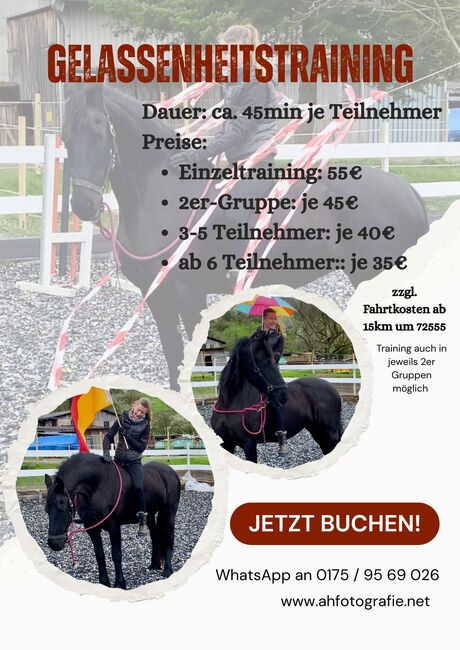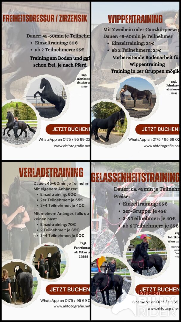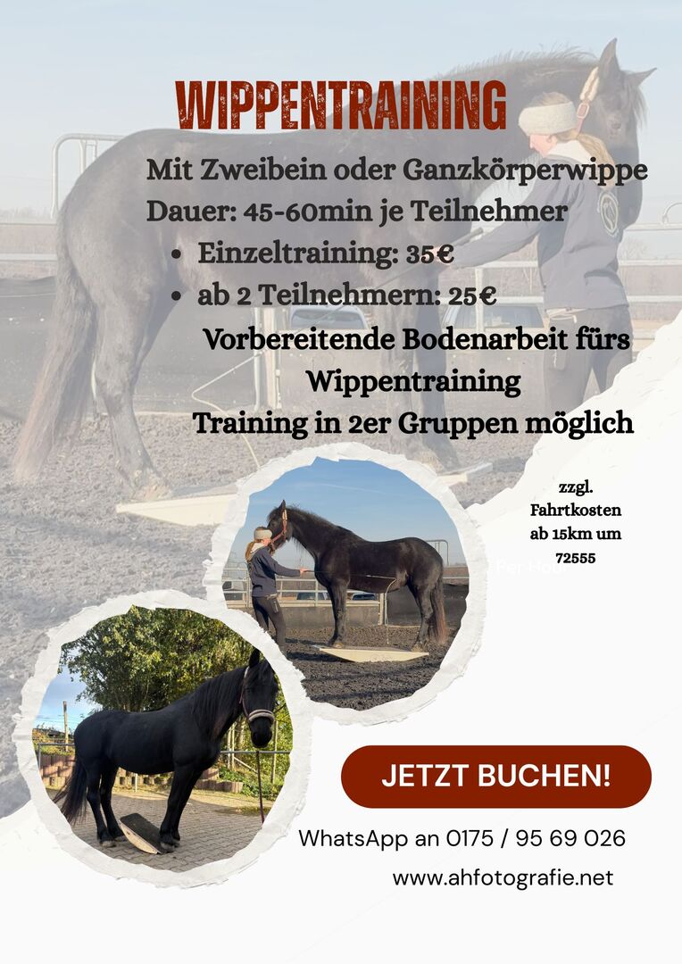 Jag erbjuder även longeringsträning. Jag har både en tvåbent gungbräda och en helkroppsgungbräda till mitt förfogande för detta ändamål.