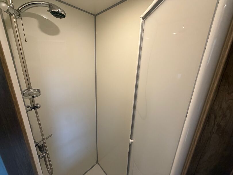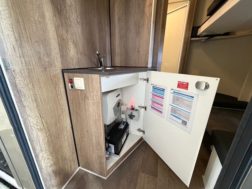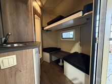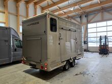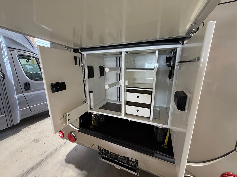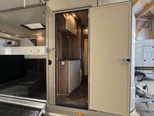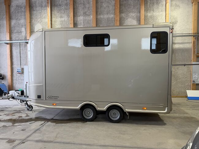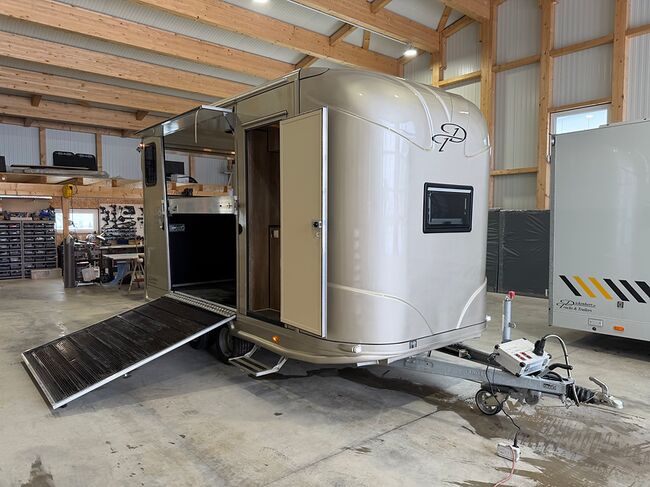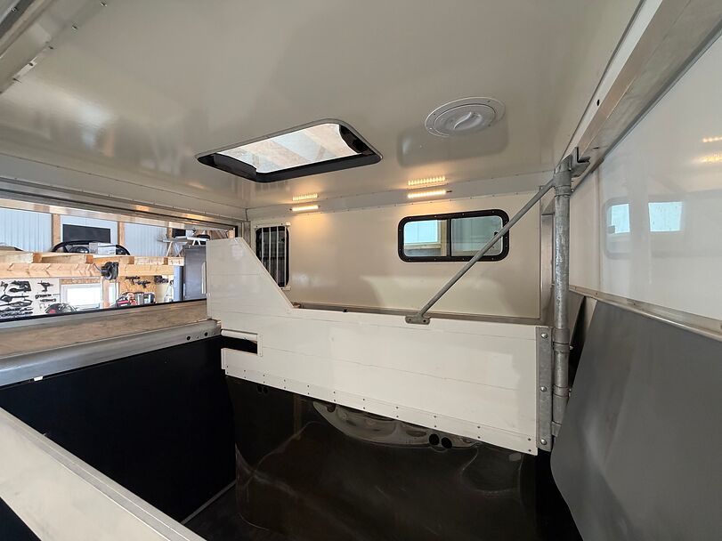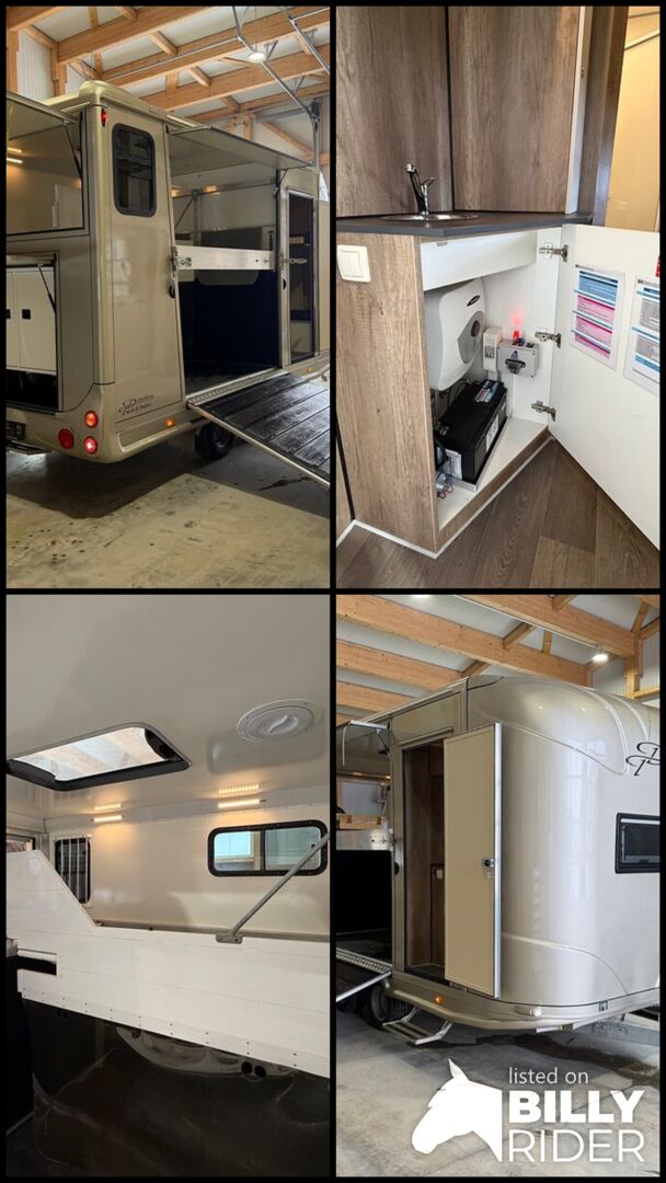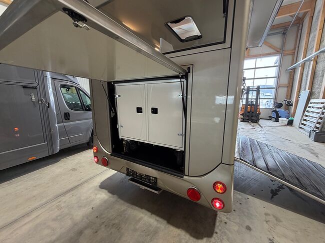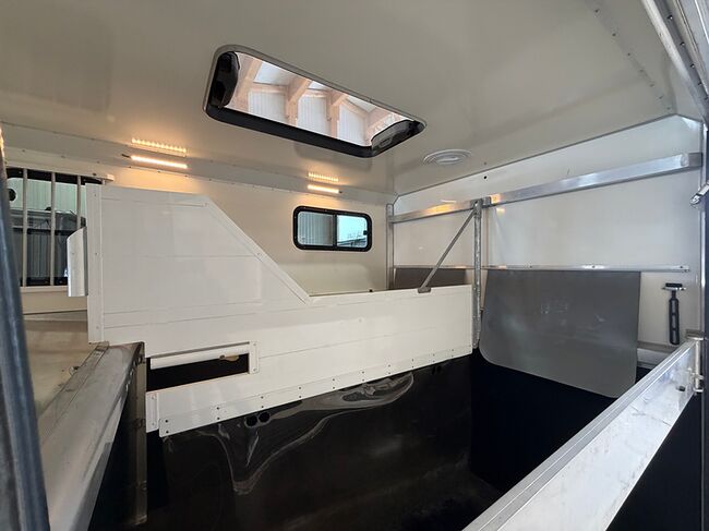 Golvkonstruktion av aluminiumprofiler med limmade på ett höghållfast gummigolv, 30 mm tjocka, helt isolerade sido- och takpaneler, aerodynamisk frontdesign Låsbar sidodörr till höger med fällbart fotsteg, bodel med sittgrupp, två sovplatser, dusch, pentry, mikrovågsugn, kylskåp, diskho, LED-belysning, 12V-batteri inkl. laddare, värmepanna, 12V-vattenpump. Sidoramp med ventilationslucka ovanför, 2 nedfällbara fönster vid hästhuvudet, ytterligare ett längsgående skjutfönster, stor taklucka, elektrisk takventilation kan kopplas från bodelen, mittvägg med transparent gardin, fodertråg vid hästhuvudet, planka vid rampen, stor lucka baktill på vagnen, perfekt för dagsturer. Stor lucka undertill för att använda det mobila sadelskåpet, som enkelt kan lastas via sidorampen genom en dörr under fodertråget.
