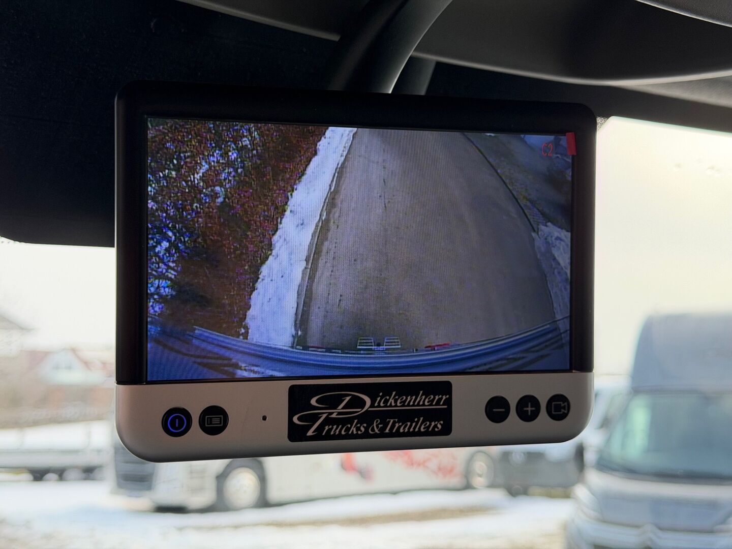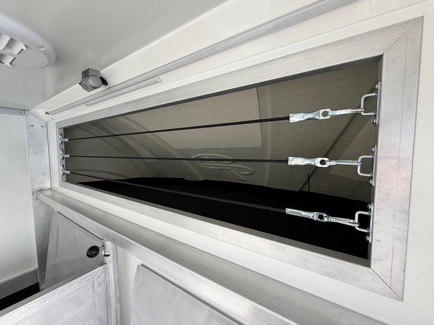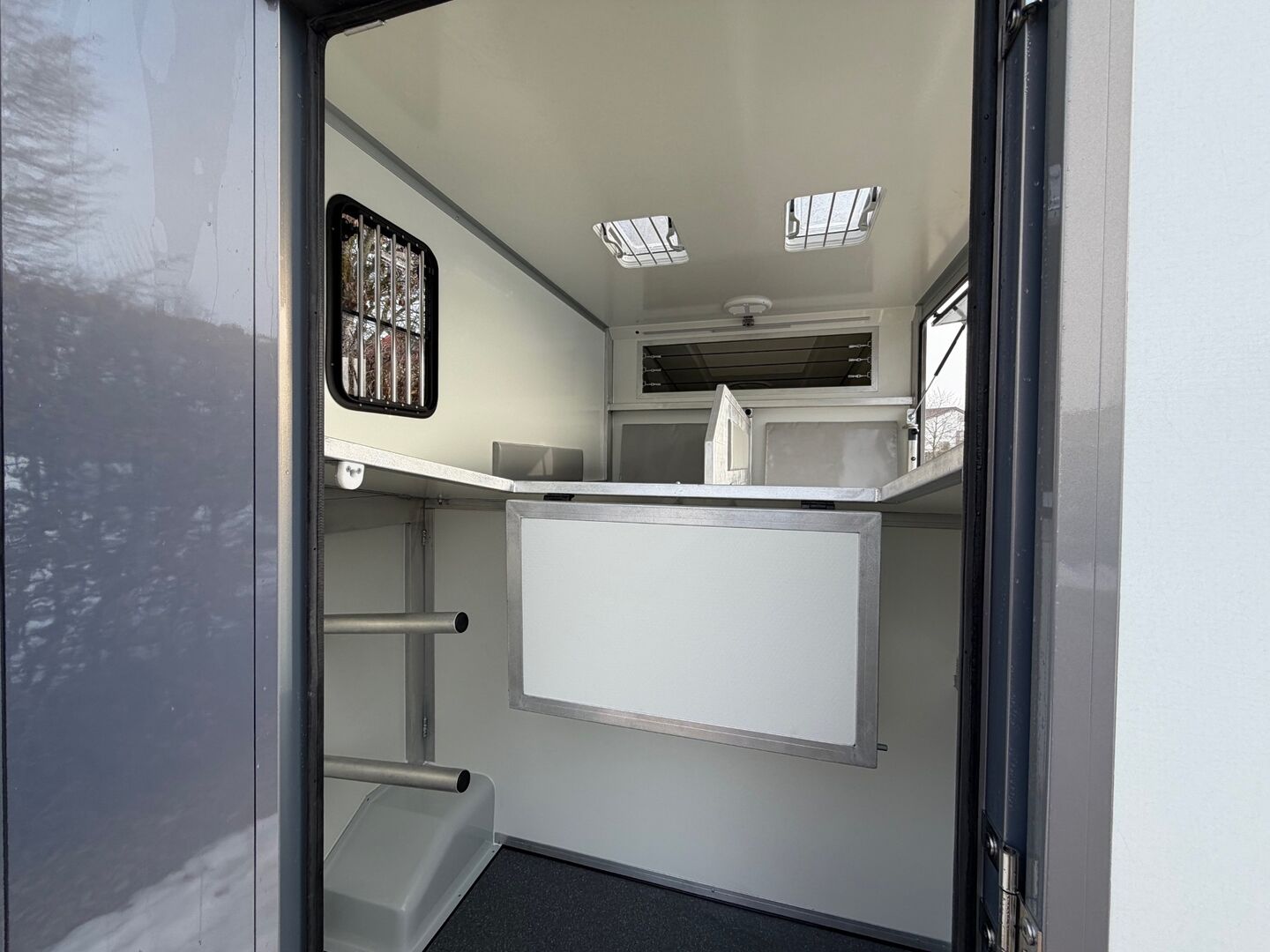 En elektrisk fläkt, 2 takluckor och 2 droppfönster på hästhuvudena ger luft och ljus i hästutrymmet. Vårt kamerasystem gör att du kan övervaka hästarna under resan och det bakre området när du backar. Vita och blå LED-lampor ger rätt belysning i lastbilen både dag och natt.