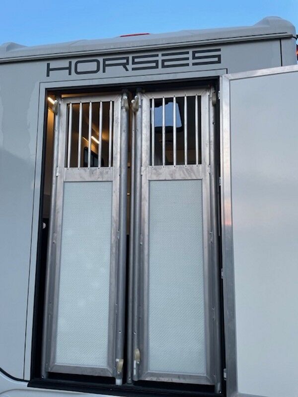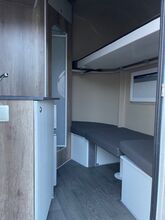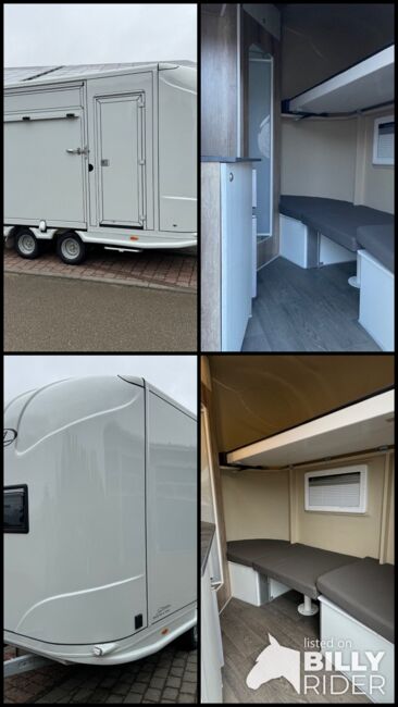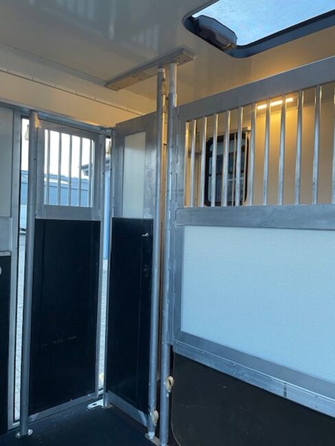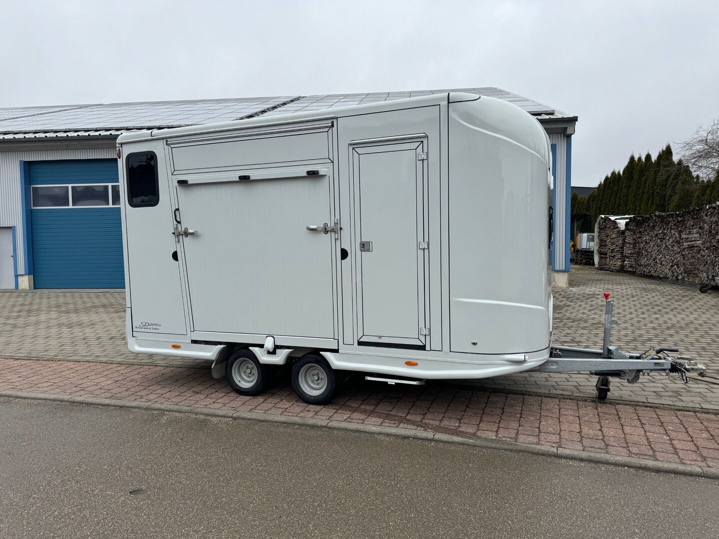 Hästtransportör Hästtrailer DT Trailer Stallion med flak Horsetrailer - Begagnad hästtrailer med hingstutrustning och bostadsutrymme Modell 2024 Tüv till 11/2027 Tillåten totalvikt 3,5 ton Utrustning: 2 parkeringsplatser i hingstversion och fullt utrustad lägenhet Galvaniserat chassi Tillåten totalvikt 3500 kg