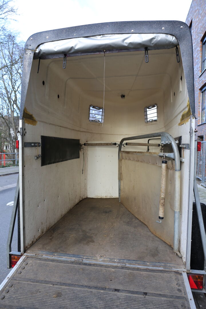 Hästvagn - full poly år 2003 - Säker hästtrailer för två hästar Högsta totalvikt 2t Tvåaxlad Broms för överkörning Ny kontakt (12-polig) Automatiskt jockeyhjul Sadelkammare med två brygghållare och två sadelhållare (utdragbara) Ljusbrytare för inomhusbelysning Invändig belysning Hållare för hönät Fodertråg Bröststänger med säkerhetsupphängning Två fästkedjor Sidokuddar Flexibel skiljevägg En av de två bakre stolparna kan också fästas lägre (höjd för medelstora islandshästar). Gummistövlar som är förseglade på sidorna Två popup-fönster Hög baklucka Belyst nummerplatta