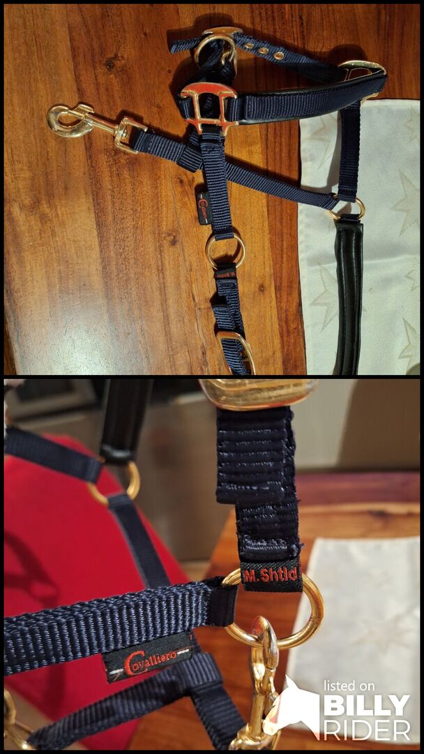 Halster för föl - Säljer min fölgrimma med läderbeklädnad inuti eftersom min åring har vuxit ur den. Den är i mycket bra skick, vacker marinblå med guldspännen.