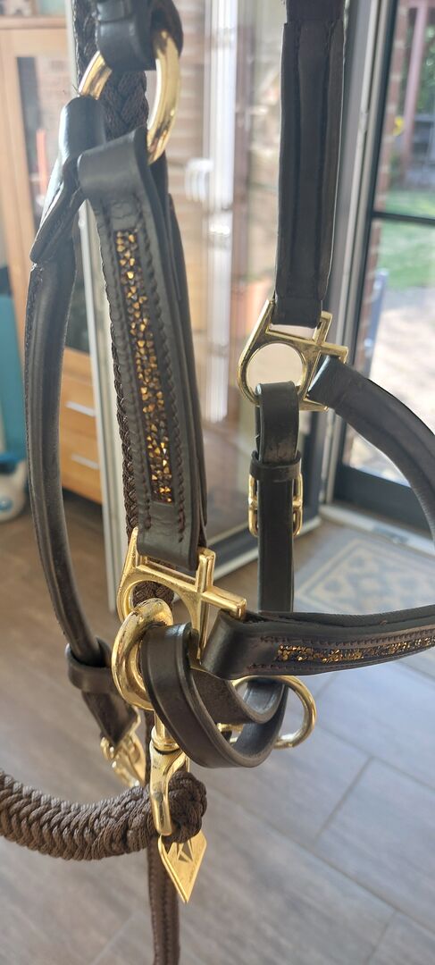 Halter från Aro Equi - Till salu en Aro Equi grimma i brunt guld med glitterdetaljer i läder.