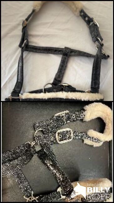 Halter, Showmaster, Ny - stor, silverfärgad, glittrande textilgrimma med teddyförstärkning på nosen och bakom öronen, ny