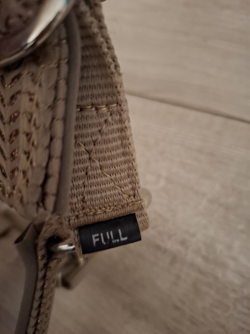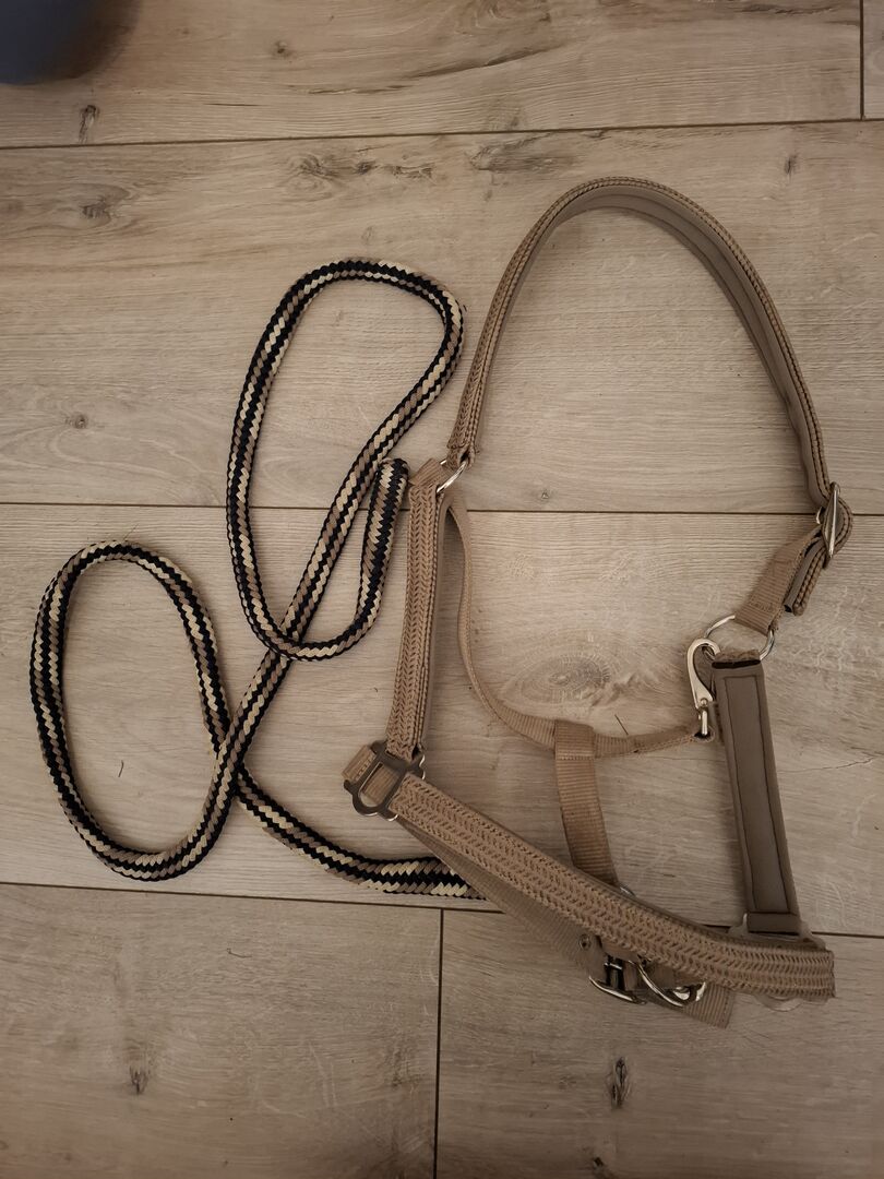 Beige med glitter, mjukt vadderad med kloroprengummi, justerbar i storlek. Färgmatchande rep med karbinhake medföljer.